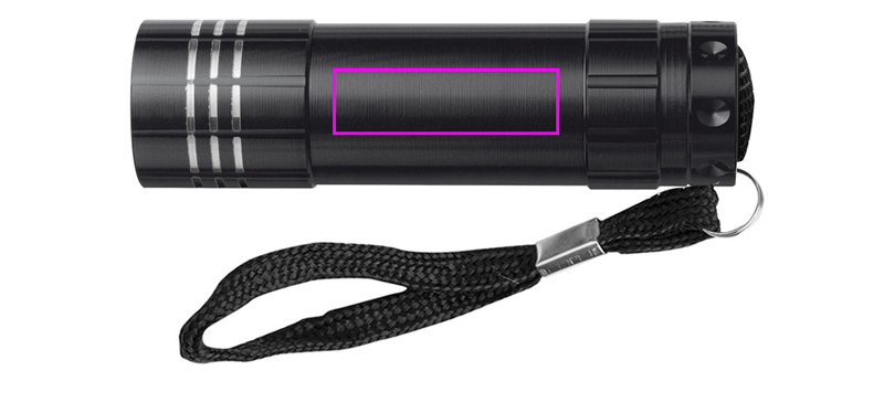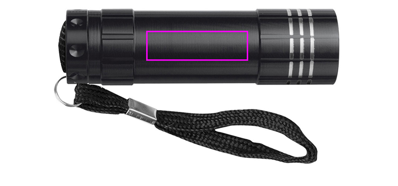 COB-Taschenlampe aus Aluminium mit sechs COBs. Ihre Werbung bringen wir mittels Lasergravur auf dem Mittelteil an. Exklusive drei AAA-Batterien (gleich mitbestellen, siehe letzte Seite oder Artikel 999400).