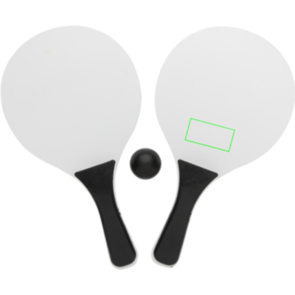 Beach-Ball Set aus MDF mit Griffen aus PP und einem Ball. In einem Netz verpackt.