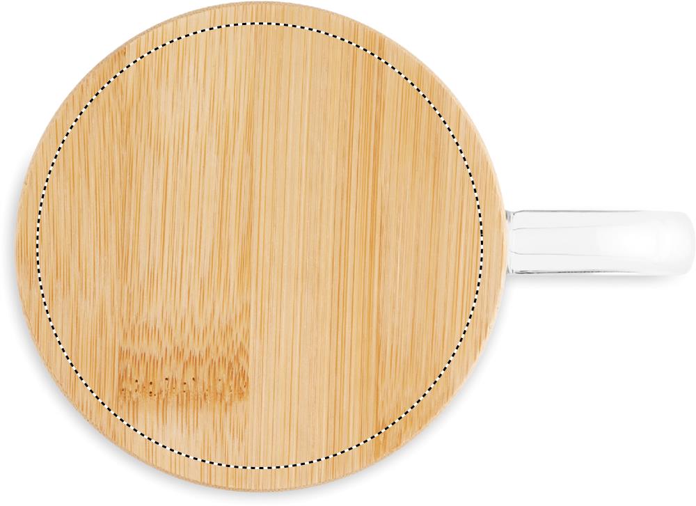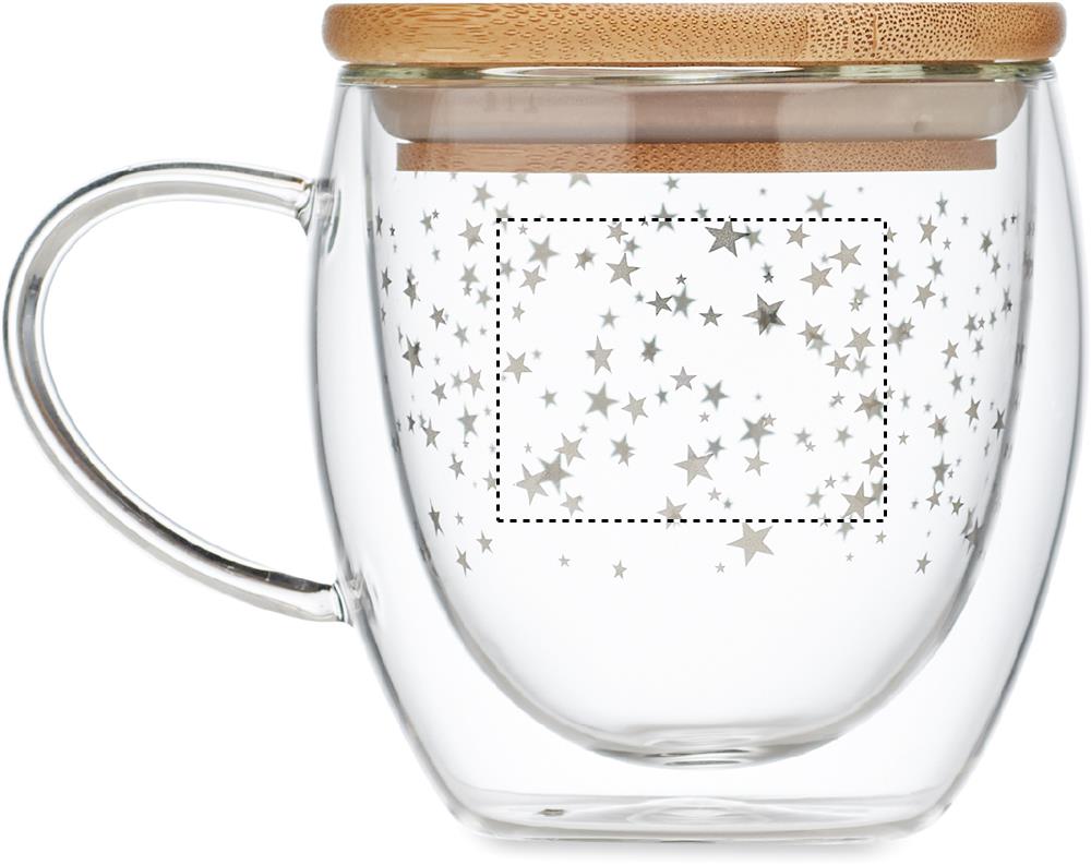 Doppelwandiger Becher mit Sternchen-Dekor aus Borosilikatglas. Deckel aus Bambus. Füllmenge: 220 ml. Bambus ist ein natürliches Produkt, es kann daher zu leichten Abweichungen in Farbe, Dekor und Maßen kommen.