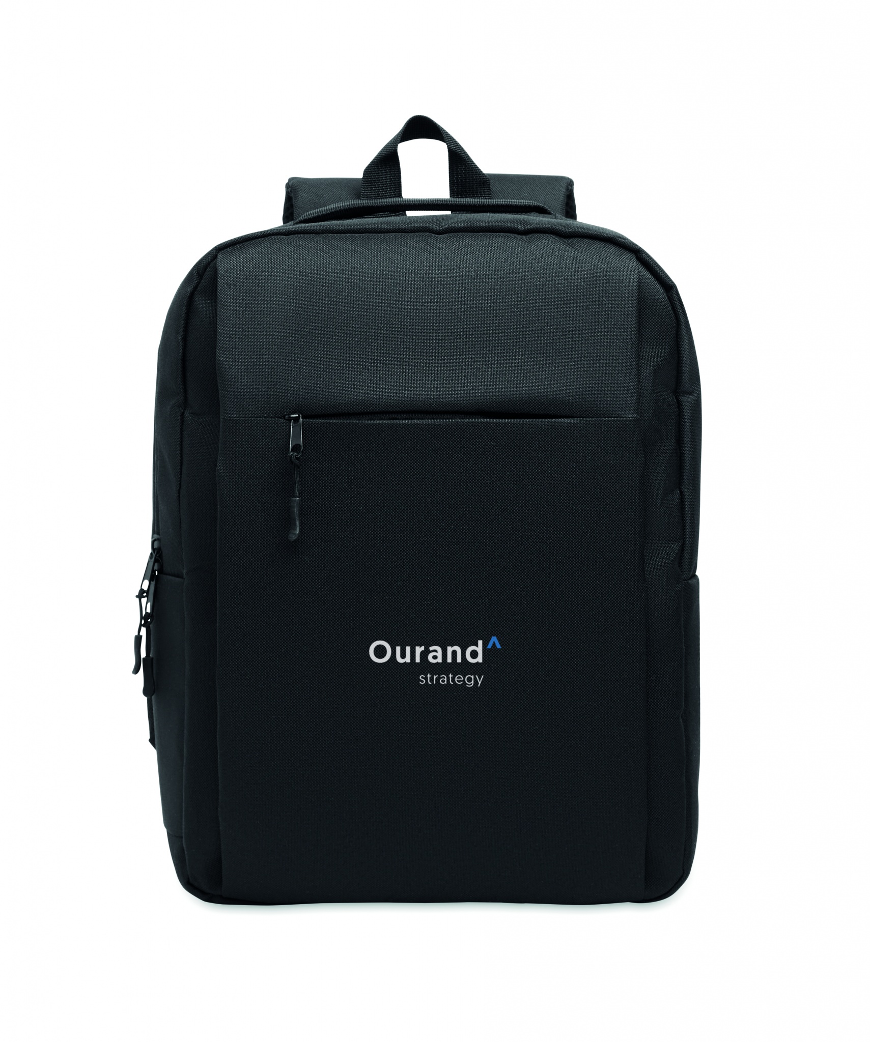 Ein Rucksack aus 600D RPET-Polyester mit 210D-Futter und individuell anpassbarem Druck, Schwarz