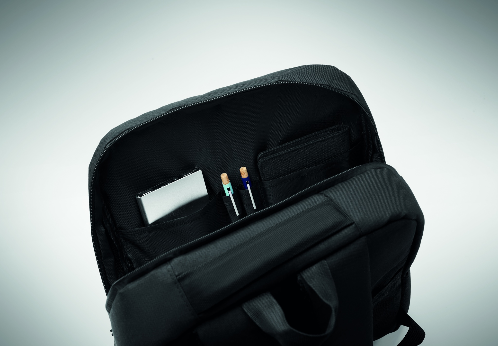 Produkte Elektronik Ein Rucksack aus 600D RPET-Polyester mit 210D-Futter und individuell anpassbarem Druck