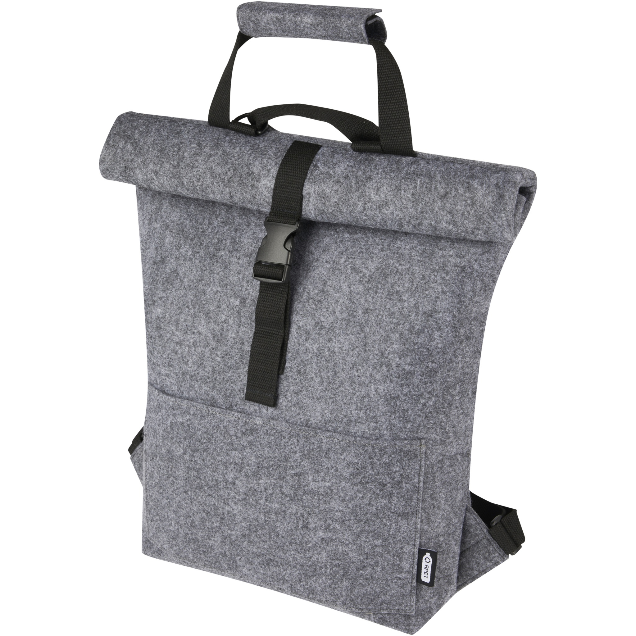 Multifunktionaler und modischer Rolltop-Rucksack und Fahrradtasche in einem. Aus hochwertigem, weichem und strapazierfähigem GRS-zertifiziertem, recyceltem Filz. Ausgestattet mit einem großen Hauptfach, einer Vordertasche, verstellbaren Schultergurten und 3 Klettverschlussgurten, mit denen die Tasche auf dem Gepäckträger eines Fahrrads befestigt werden kann. Die Schultergurte lassen sich leicht in ein langes Tragegriffsystem umwandeln oder so bündeln, dass sich die Gurte nicht in einem Fahrradrad verfangen können.