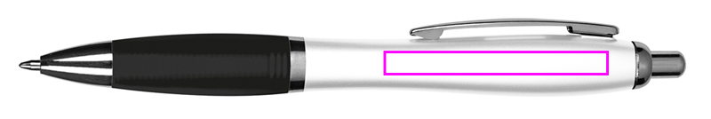 Kugelschreiber mit weißem Schaft, Metallclip, blauschreibender Großraummine und farbiger Soft-Touch-Griffzone. Ihre Werbung drucken wir auf die rechte Seite des Clips.
