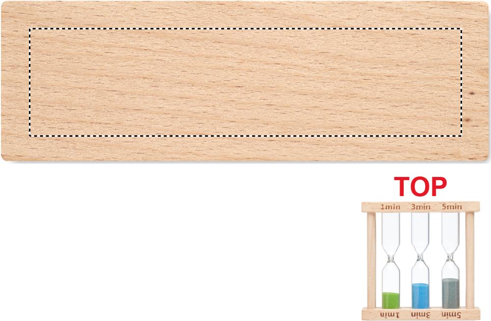 Sanduhr mit 3 unterschiedlichen Zeitanzeigen (ca. 1, 3 und 5 Minuten). Halterung aus Holz.