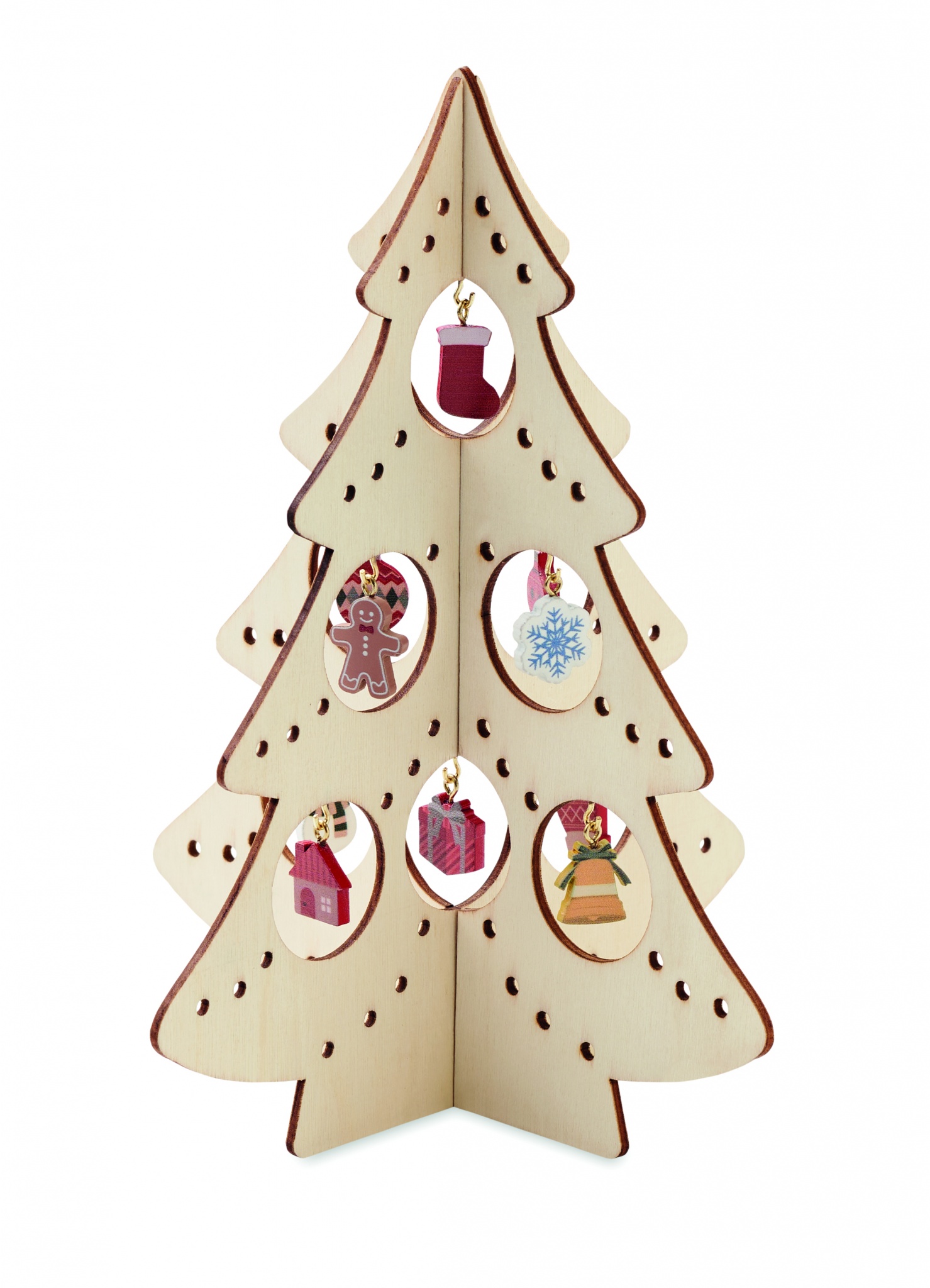 Weihnachtliche Dekoration aus Sperrholz in Form eines Weihnachtsbaumes mit 10 unterschiedlichen Ornamenten. Montage erforderlich.