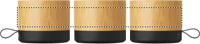 Wireless 5.1 speaker with bamboo casing and ABS base. Features 3W mono sound. Includes rechargeable and replaceable 500mAh battery. Compact and modern design.