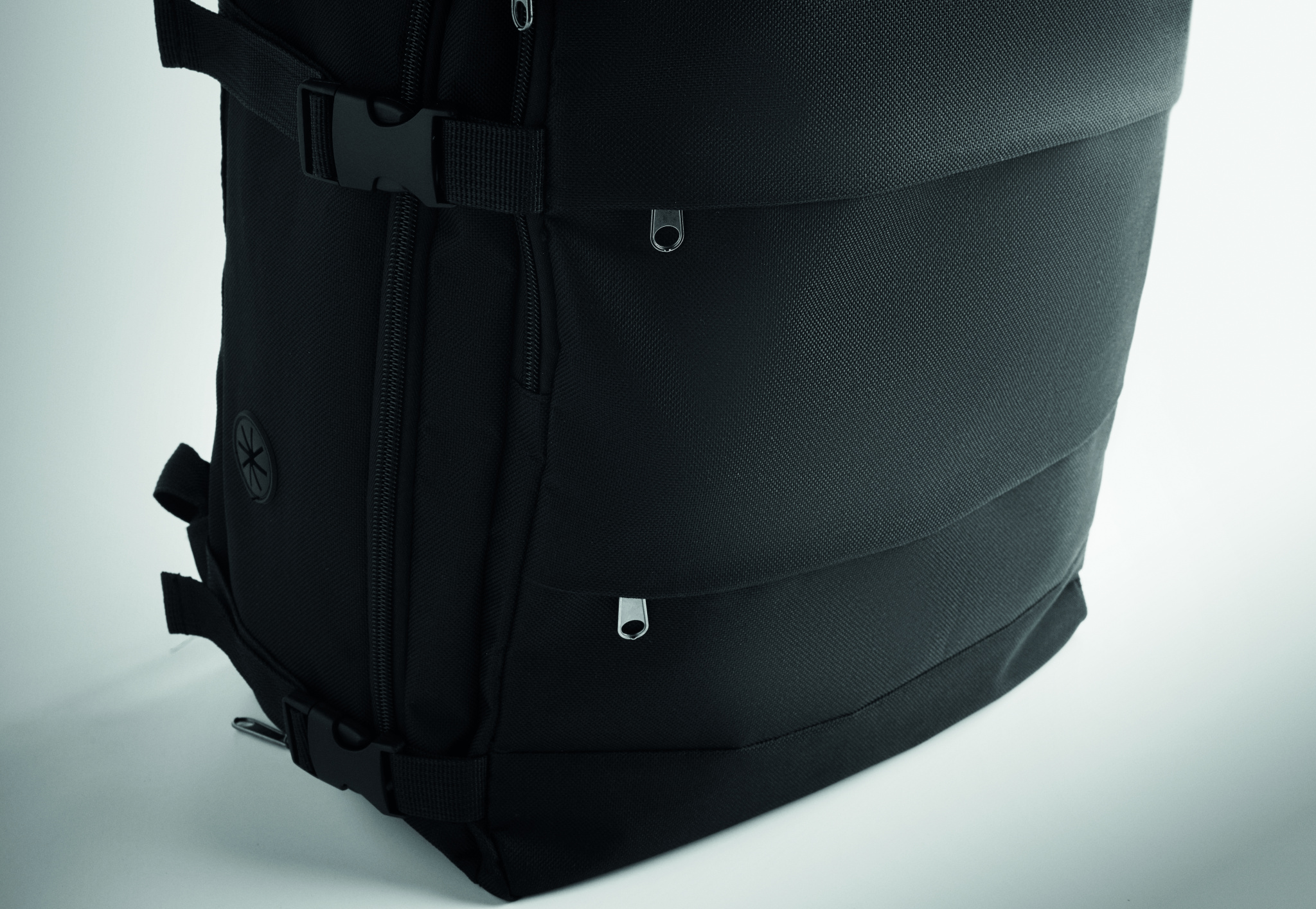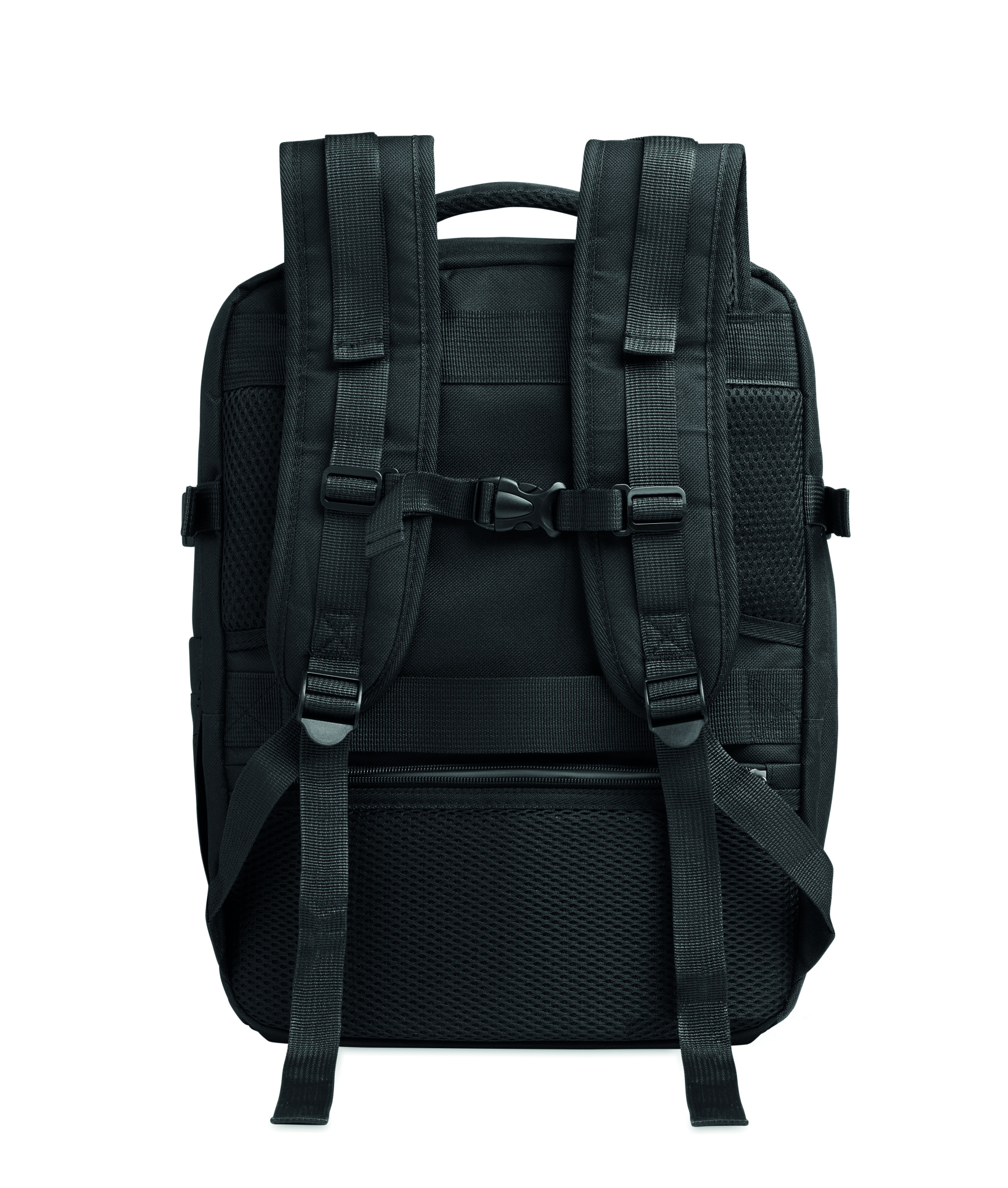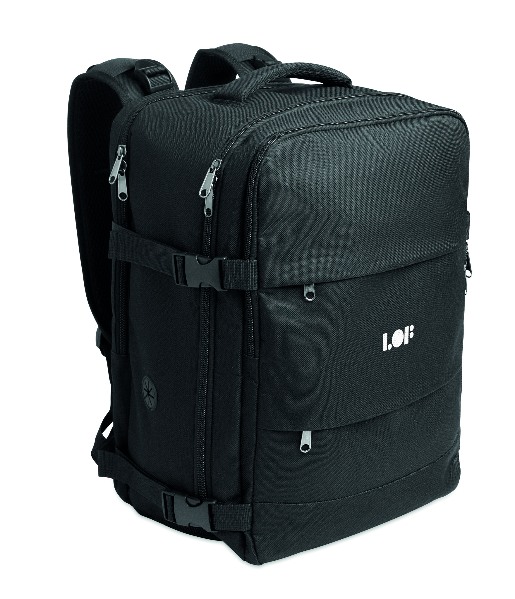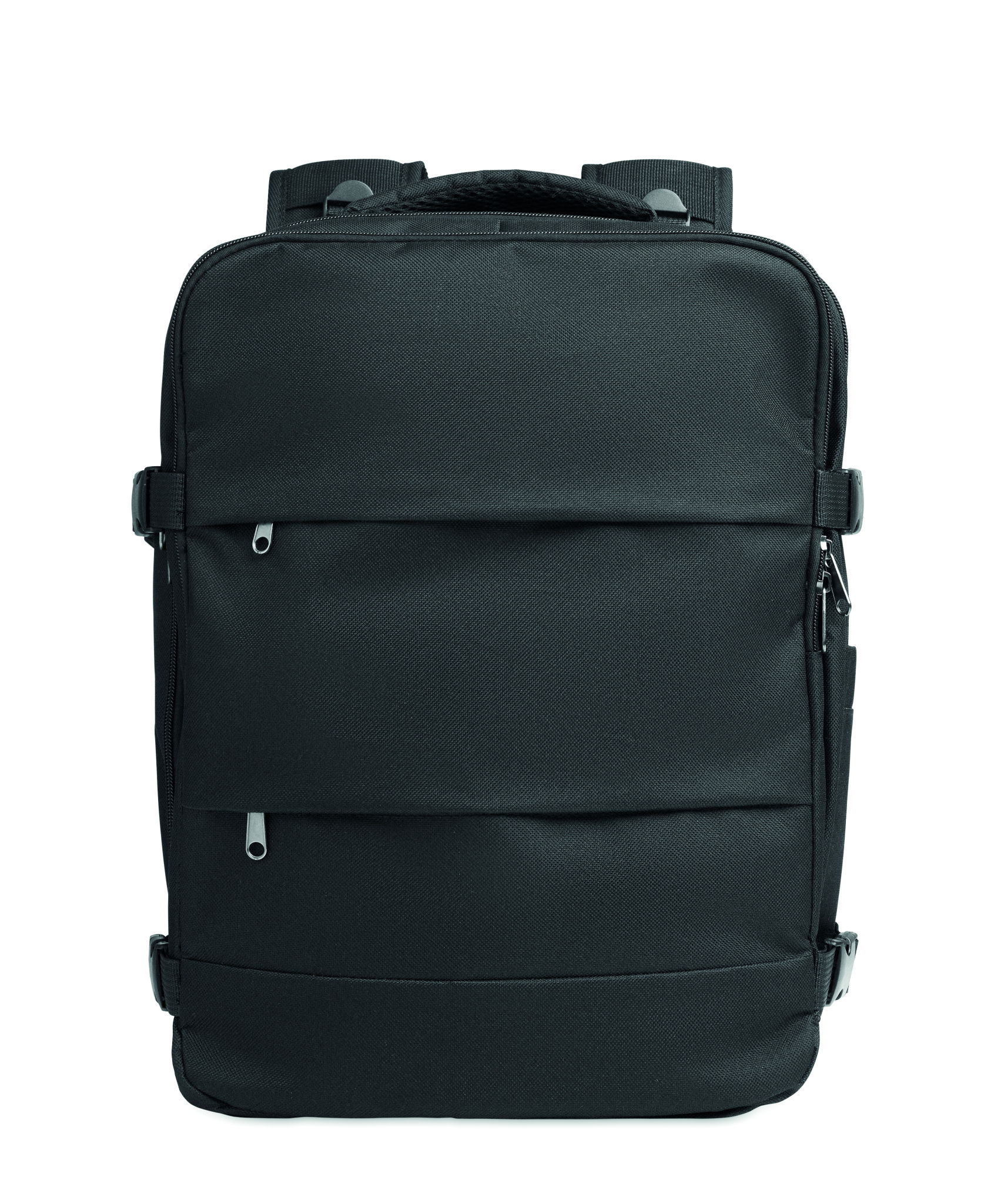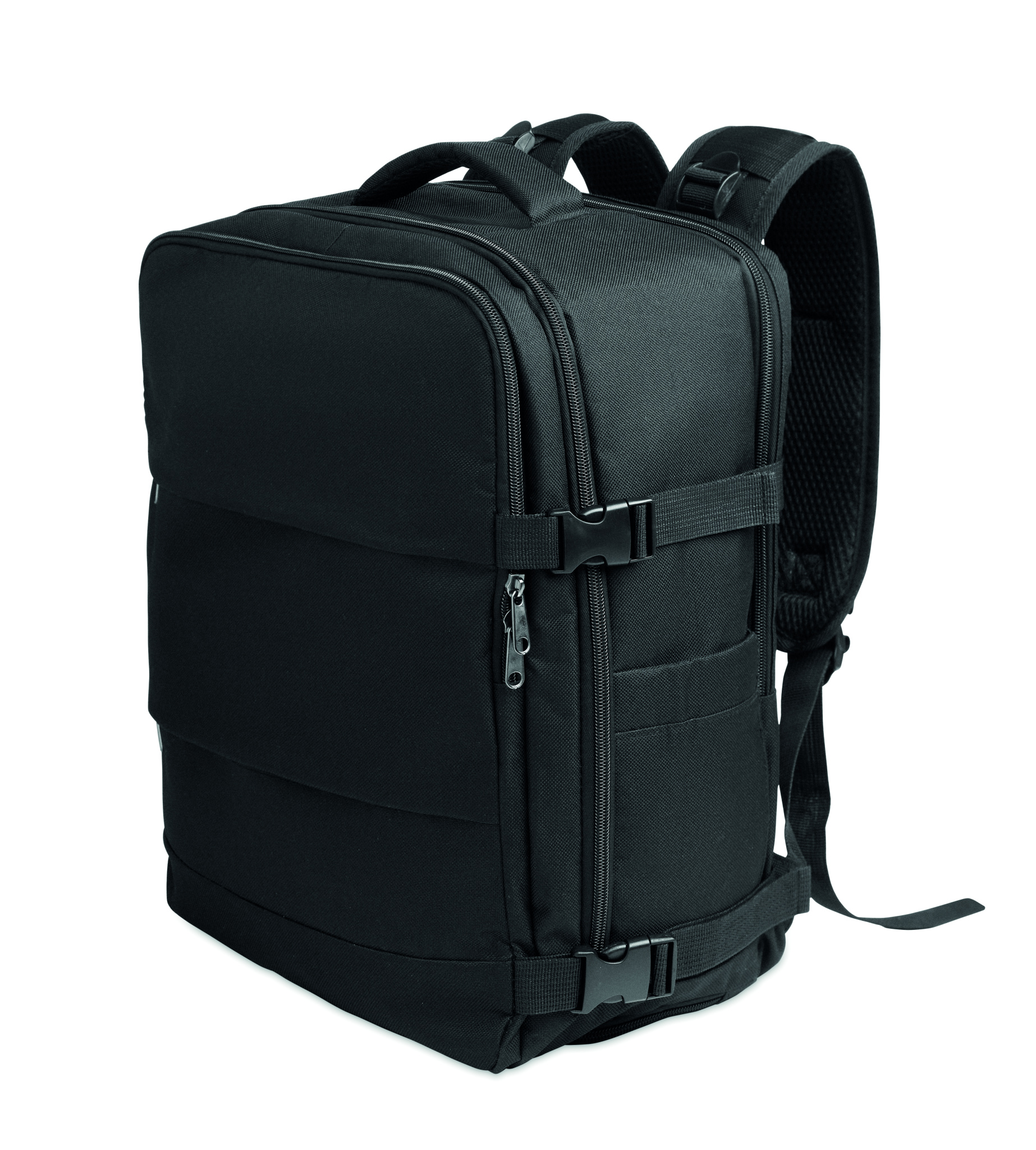 Cabin-size extendable backpack in 600D RPET polyester with PU backing and 180o opening. Includes shoe division, padded 15'' '' laptop pocket, mesh straps, luggage strap, and side buckles.