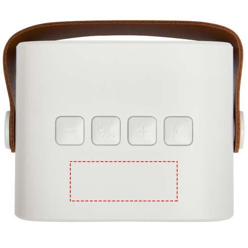 The Diya wireless speaker is made from recycled plastic and has a PU leather strap for easy portability. It delivers 3 watts of powerful sound and supports MP3 playback via Micro SD. Enjoy seamless connectivity with a line-in option and recharge effortlessly through the Type-C charging port. Playback time at max volume is approximately 3 hours and the speaker can be fully charged 0-100% in approximately 2 hours.