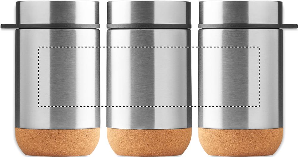 Double wall stainless steel insulated storage jar with a screw top and cork base detail. Includes spoon. Capacity: 400ml. Cork is 100% natural material. Due to its structural nature and surface porosity the final print result per item may have deviations.