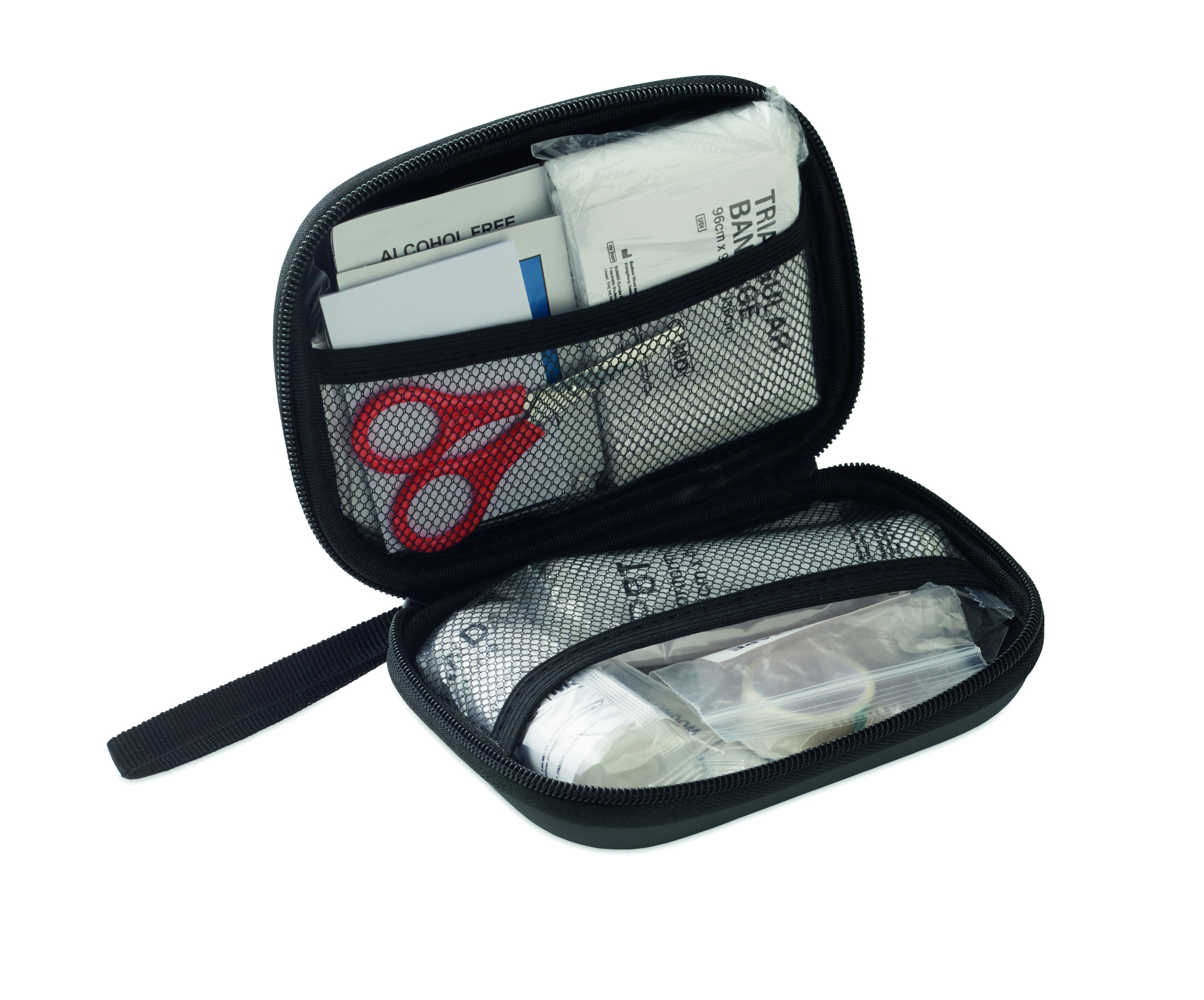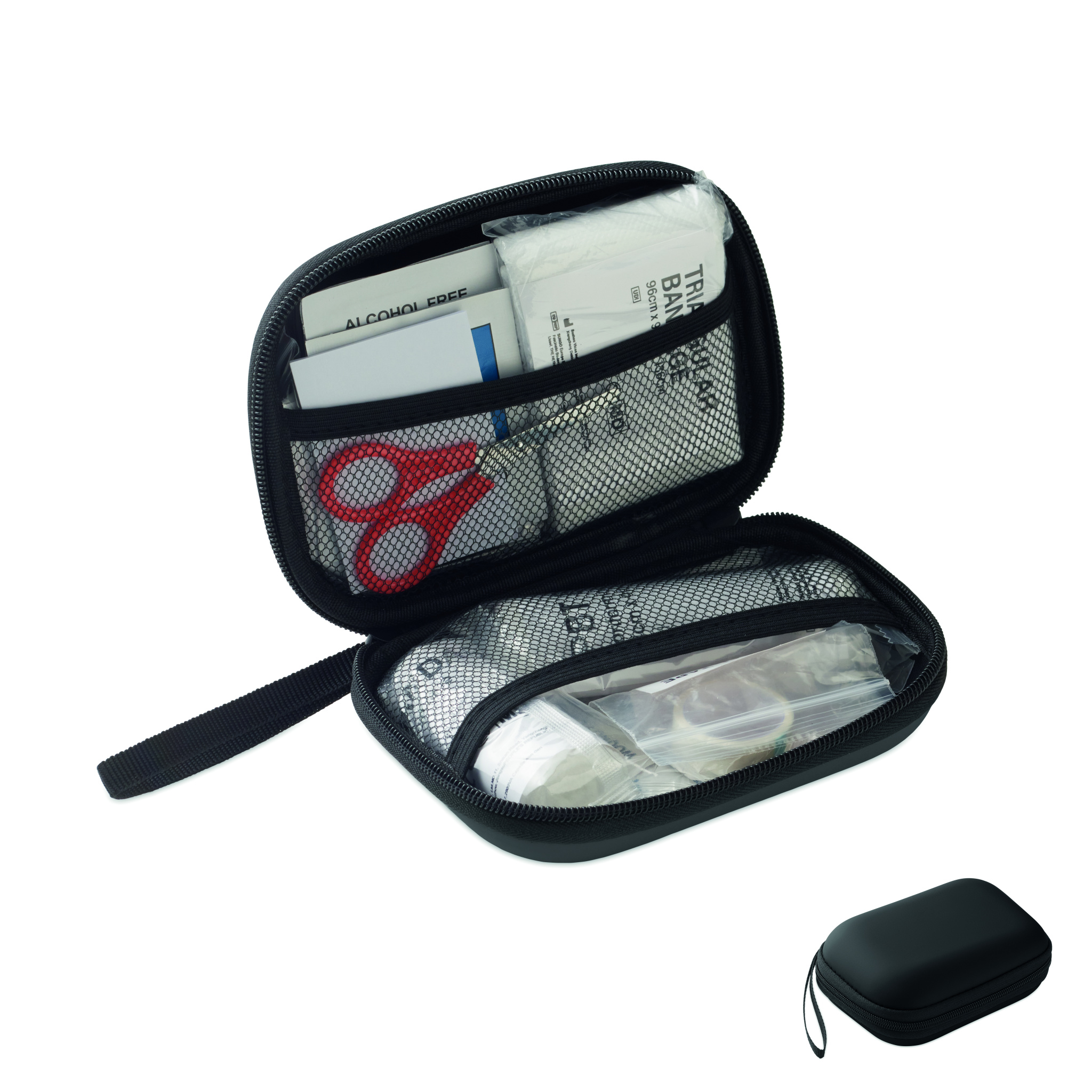 First aid kit in hard PU case. Includes 2 gloves, 1 blanket, 1 tape, 2 bandages, 1 scissors, 4 swabs, 10 plasters and 6 cleaning wipes. Not available for sale outside the EU.