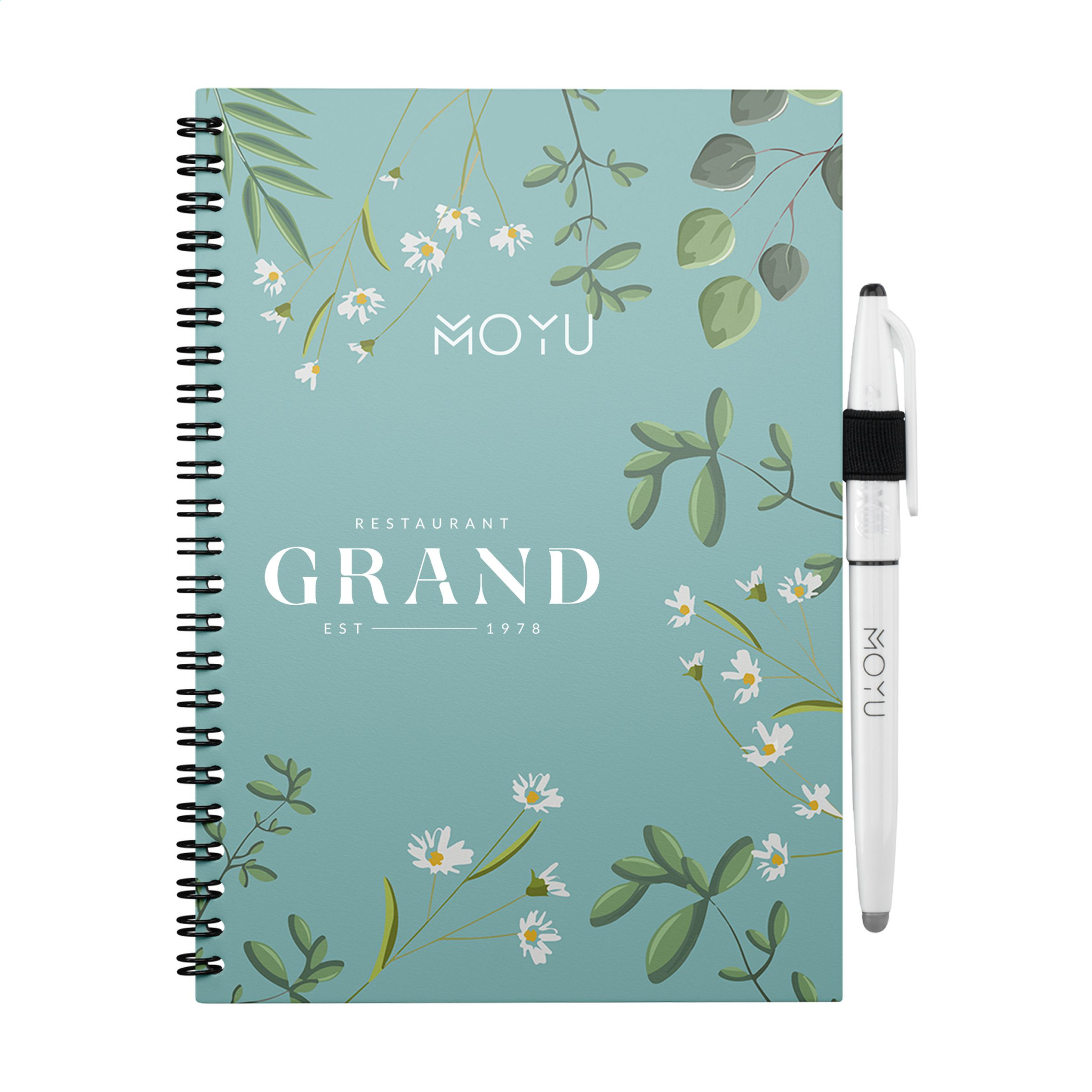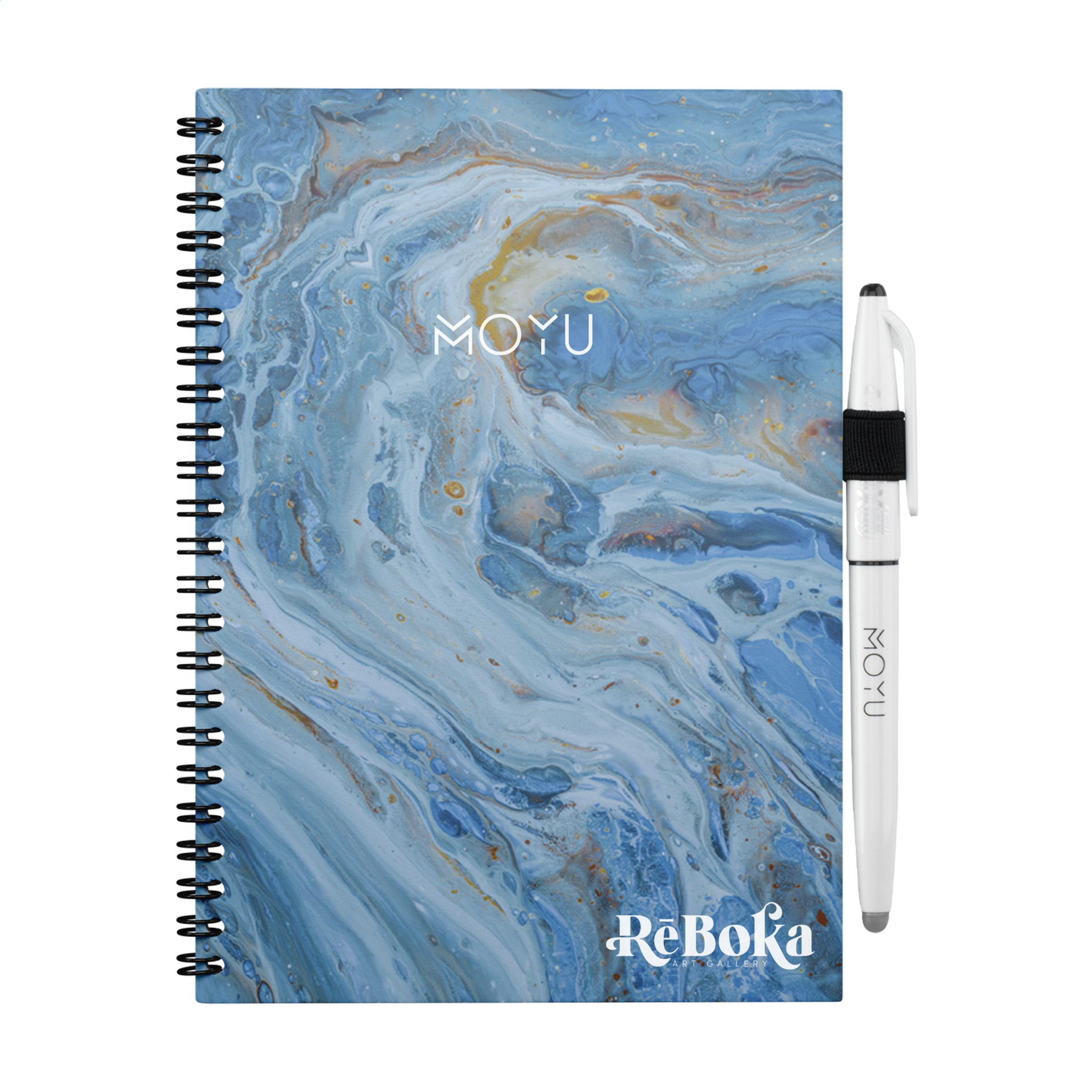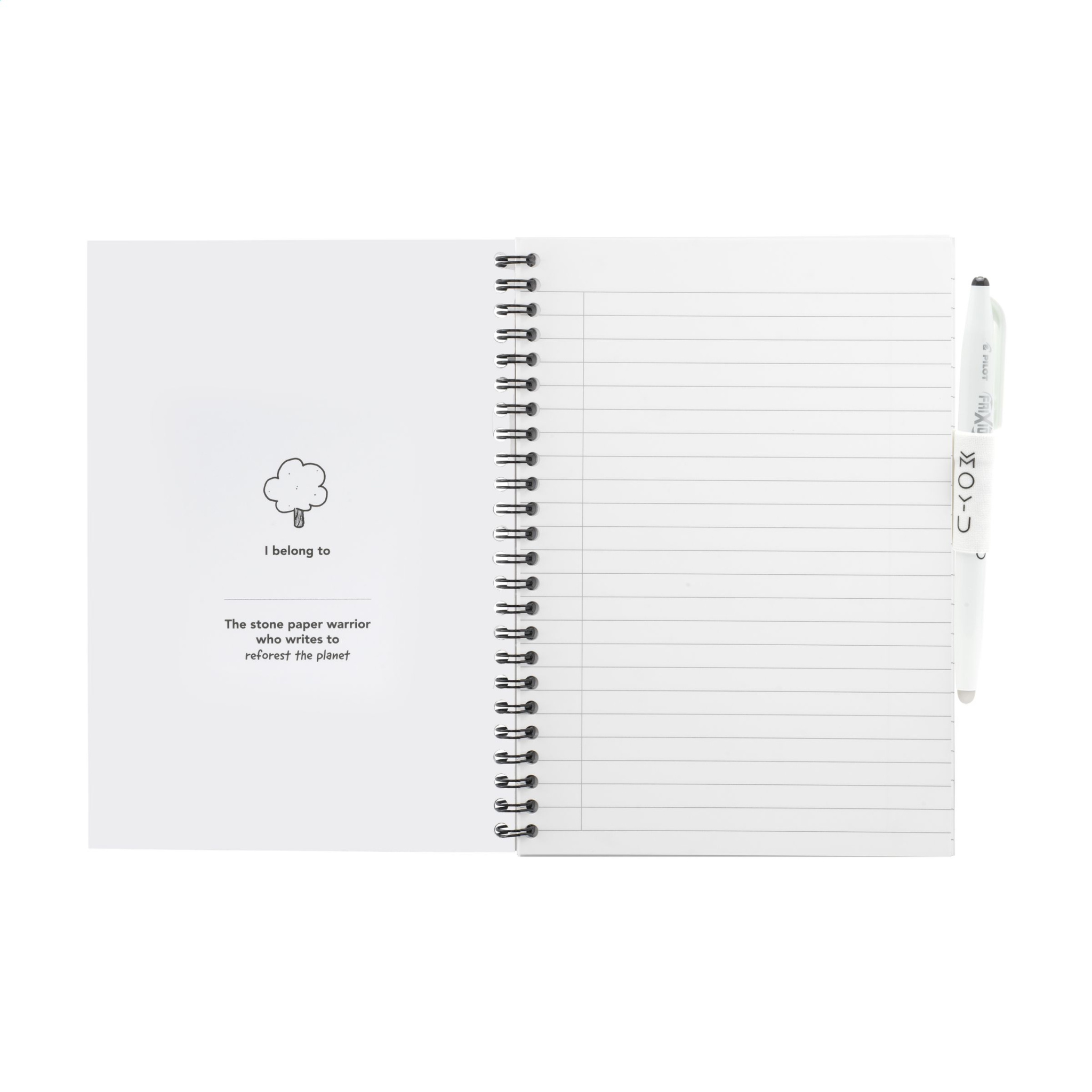 MOYU branded A5 erasable notebook made from stone paper. With bendable 400 grams soft cover. This notebook includes a pen and cleaning cloth. Each stone paper page is sustainably produced, naturally tree-free and 100% recyclable. This notebook, with an elastic pen loop, is bound in a strong wire-o binding and has 18 pages lined paper, blank paper. Take down notes with the accompanying, special MOYU pen. This pen contains the original Frixion ink. This special ink dries completely on stone paper and is easy to erase without leaving a trace. Slightly moisten the supplied MOYU cloth with some water and erase the ink. This way, pages remain empty for new ideas and to-do lists. You can write on rock paper 500 times on average. This notebook will last you for years. When ordering 50 pieces or more, you can select to have the cover printed with your own full colour design. Stone paper is made from 80% limestone and 20% clean plastic. It is naturally tree free, and no water or chemicals are required to make it. The production of stone paper is therefore more economical and produces 67% less CO2 than in the production of pulp paper. In addition, stone paper can be recycled endlessly, without having to add new raw materials.