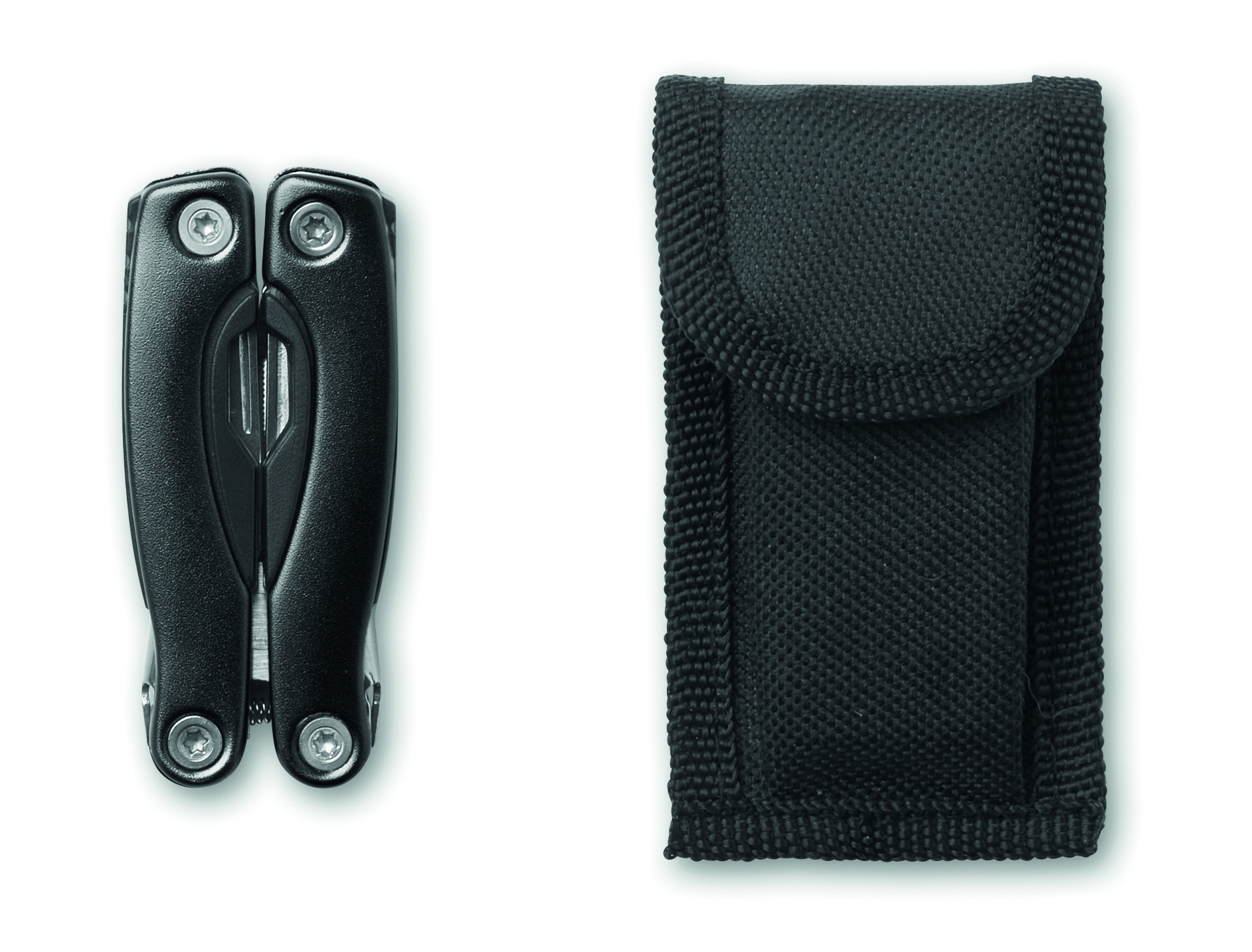 Foldable multi-tool in stainless steel with stainless steel pliers. 9 tool functions. 600D polyester pouch included.