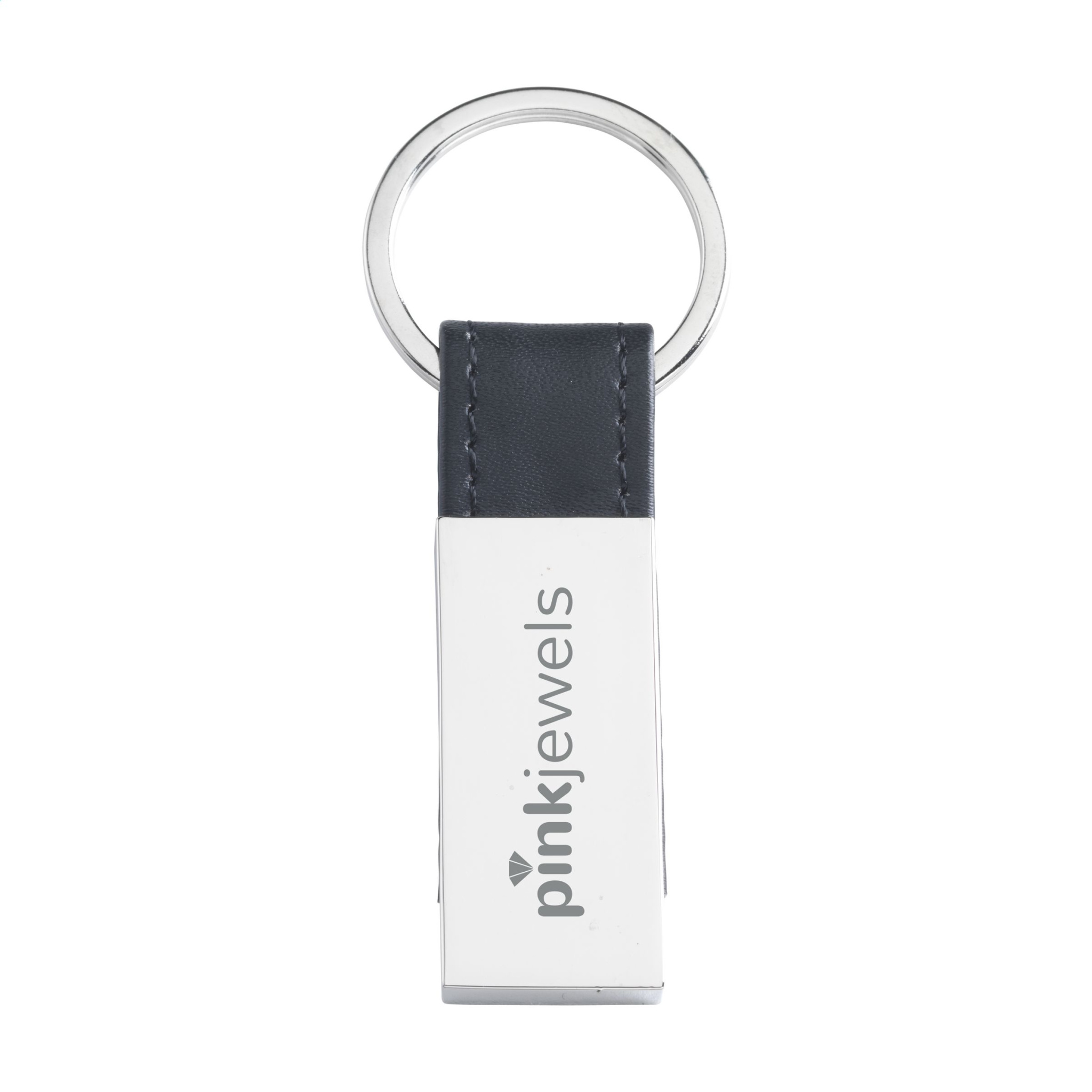 Metal keychain combined with black PU leather look material. On sturdy keyring. Each item is individually boxed.