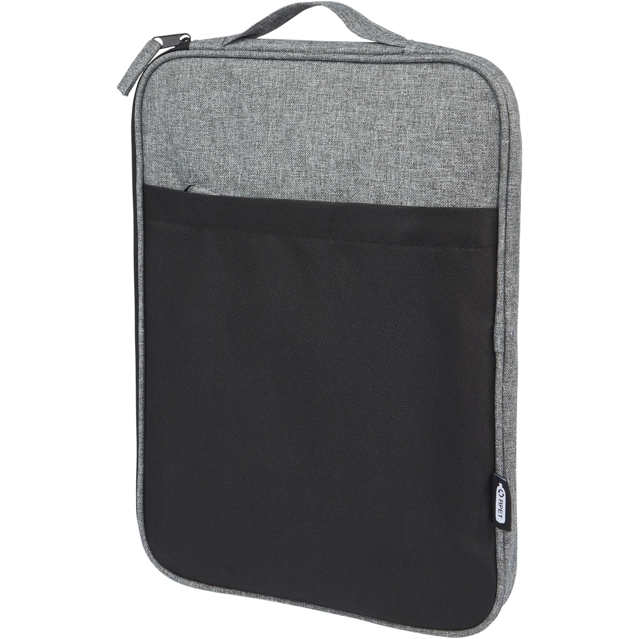 The two-tone laptop sleeve is made from 100% GRS recycled materials on the exterior, and it features a compact and protected laptop compartment fitting most 14" laptops. It also has a zippered front pocket for documents, notebooks and small accessories, and a carrying handle, making it perfect for daily commuting.