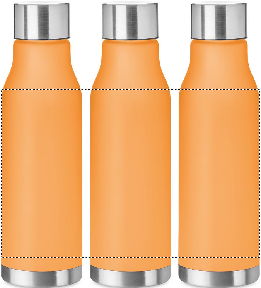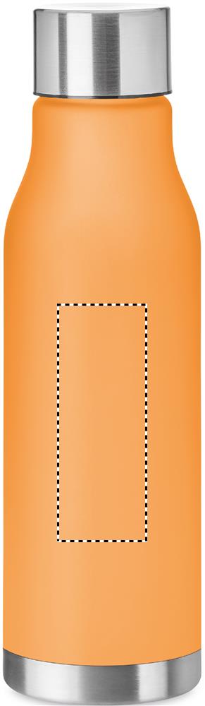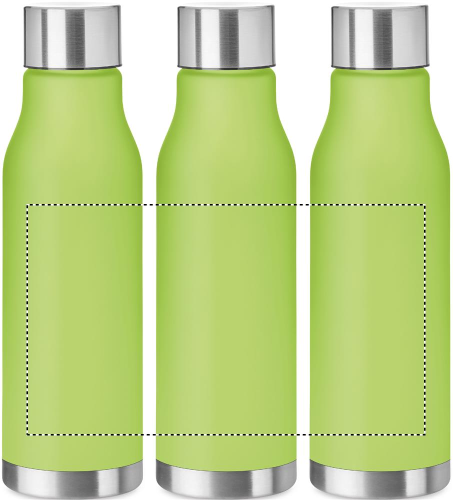 Drinking bottle in RPET with rubberised finish (frosted transparent) and stainless steel cap with inner RPET lid and silicone ring. BPA free. Leak-free. Capacity: 600 ml. Not suitable for carbonated drinks.