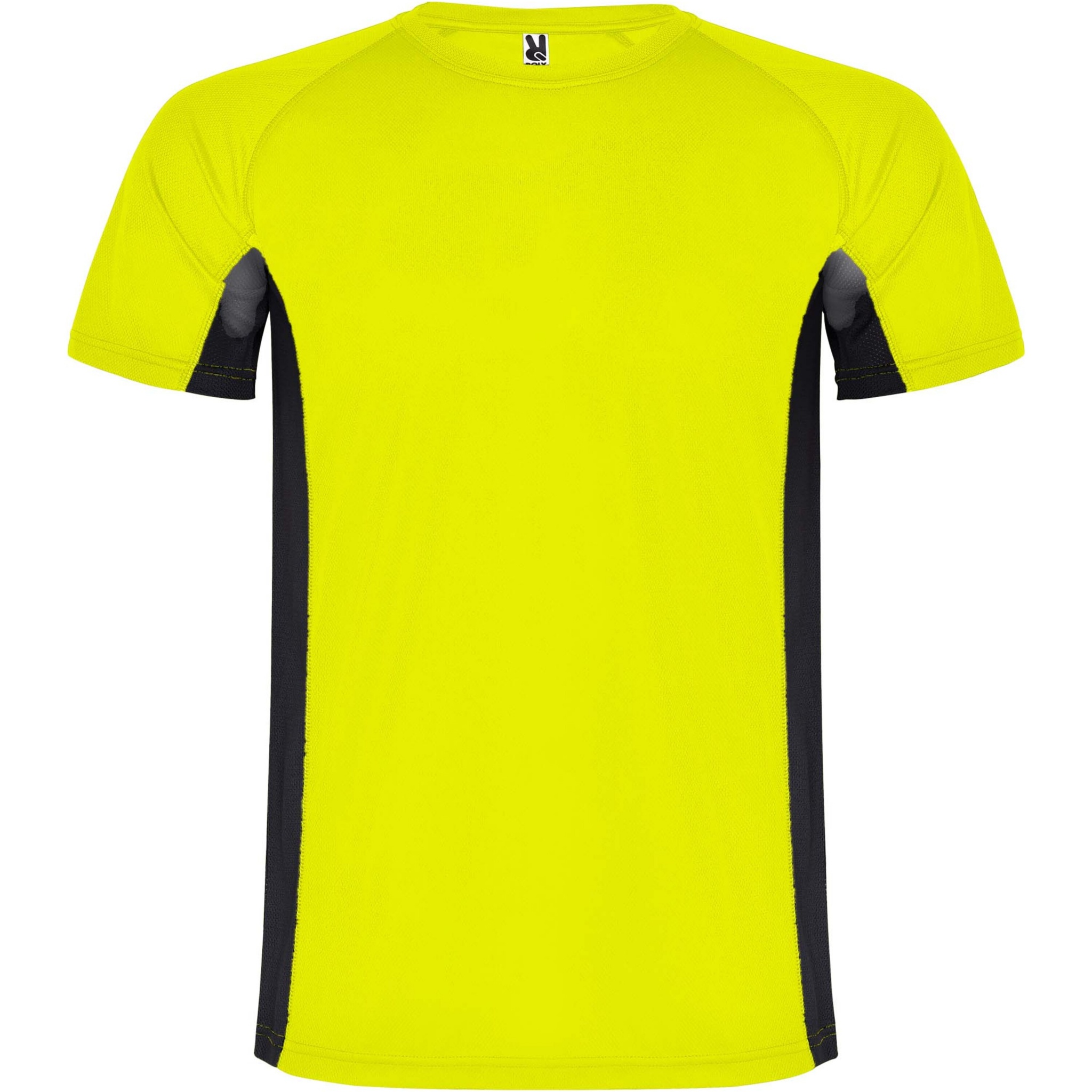 Technical and breathable fabric. A combination of two polyester fabrics: Main fabric in birds eye, side panels and inner sleeve in microperforated fabric. Crew neck with inner reinforced covered seams. Removable label.