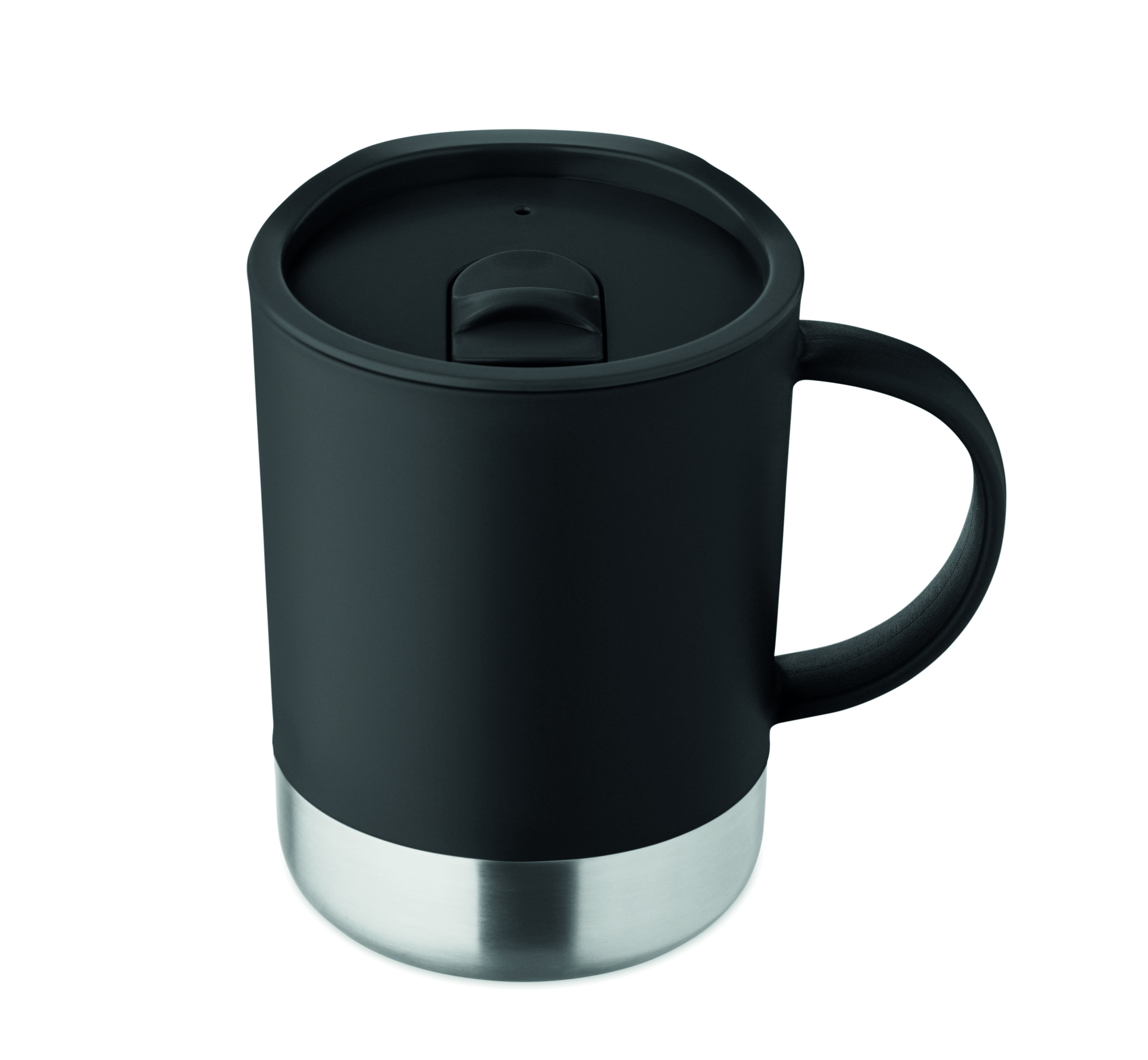 PP mug with recycled stainless steel base (90 % recycled stainless steel and 10% stainless steel) and PP sliding lid. Capacity: 300 ml.
