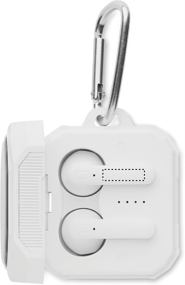 ABS True Wireless Stereo (TWS) 5.3 wireless earbuds with microphone and carabiner. 30 mAh battery. Playing time approx. 4 hours. It has a solar charging battery. Auto-pairing. Including a Type C charging cable and a 200 mAh charging station.