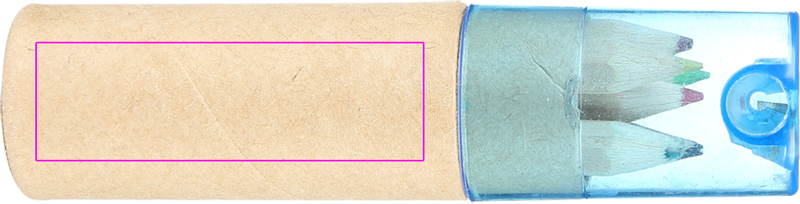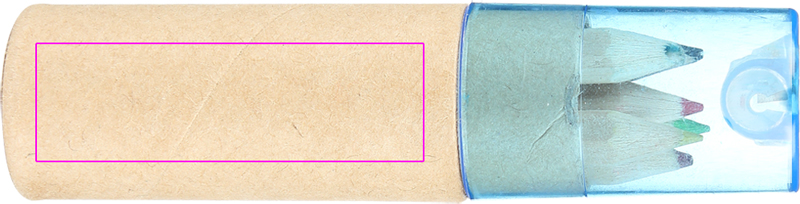Cardboard box with six short, thick colored pencils and integrated sharpener with blue transparent plastic lid. We will pad print your logo on the box.