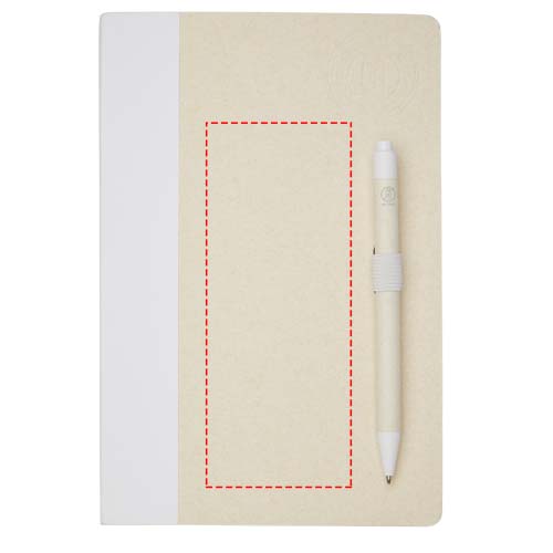A5 suuruses teatmemärkmik ja pastapliiatsi komplekt. Märkmikus on 80 vooderdatud lehte (80 g/m²), mis on valmistatud taaskasutatud piimapakkidest (kuni 70%), värvilisest paberist seljaosa ja pliiatsi aas. Pliiatsi aasas on märkmikuga sobivas värvitoonis klõpsuga pastapliiats. Pliiatsi silinder on valmistatud samast taaskasutatud piimakarbi materjalist ning nupp, klamber ja ots on valmistatud värvilisest PLA plastikust. Pliiatsi sees on must täidis. Kasutatud piimapakke kogutakse, sorteeritakse, töödeldakse ja muudetakse paberiks, muutes jäätmed tõeliselt kasulikuks.