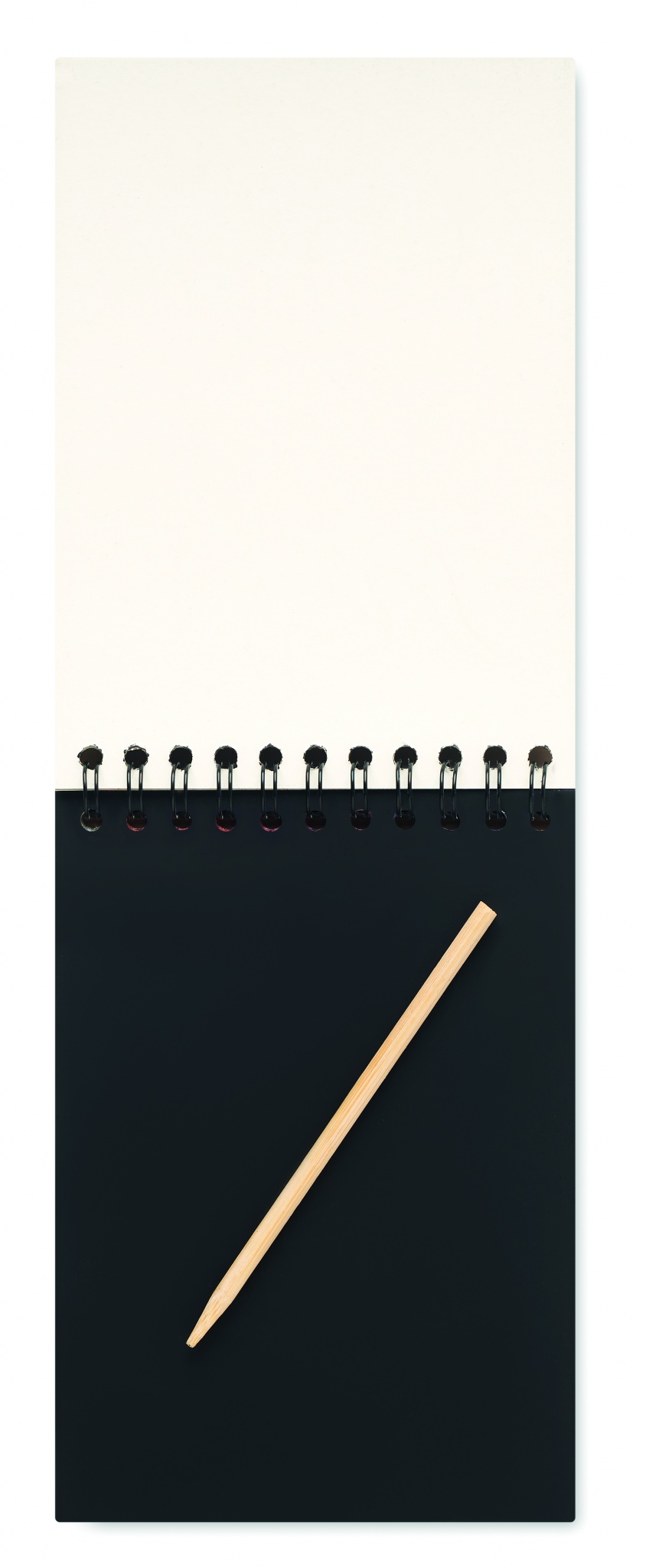 Rõngas jõupaberist märkmik, mis sisaldab 10 musta kraapimislehte ja puidust pliiatsit.