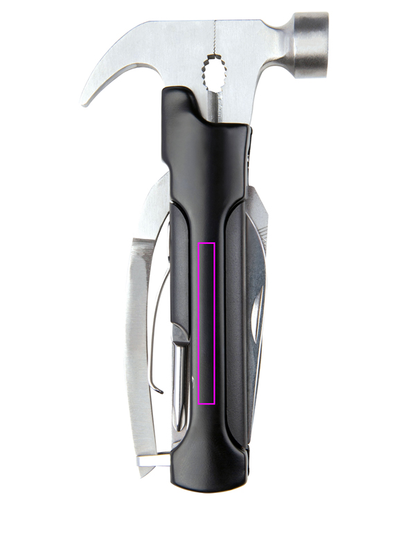 Multifunktsionaalne tööriist (roostevaba teras), mis koosneb haamrist, viilist, kahest labast, saest, pilukruvikeerajast ja pudeliavajast. Kaasas on sobiv ümbris, mille keskele trükime teie logo.