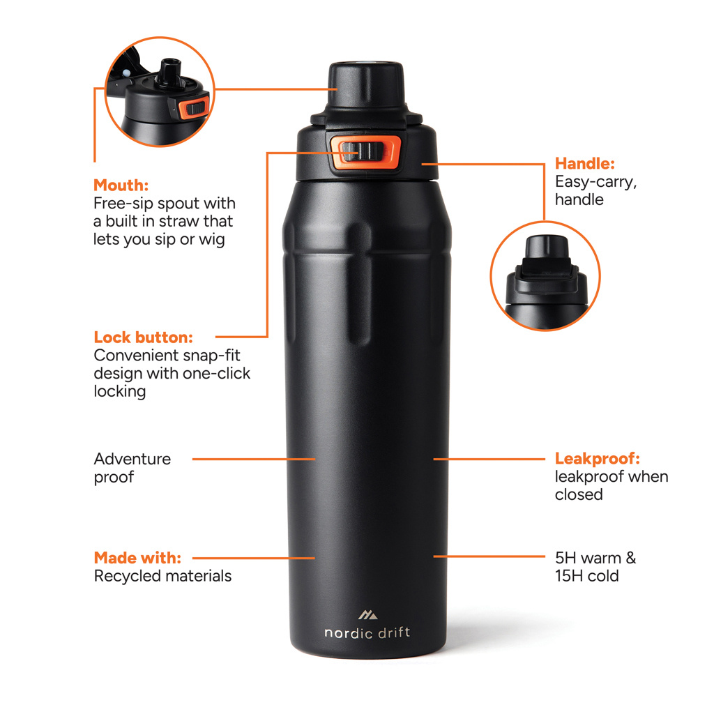 Tutvuge Nordic Drifti taaskasutatud terasest pudeliga, mis on valmistatud 79% ulatuses RCS-sertifitseeritud taaskasutatud roostevabast terasest. Seiklusteks loodud 750 ml mahutavusega pudelil on vastupidav pulbervärvitud korpus, kandekäepide ja lukustatav kork turvalisuse tagamiseks. Uuenduslik kork pakub kahte joomisvõimalust. Kaasas on FSC kinkekarp. Kõik Nordic Drifti tooted on kvaliteedi osas testitud. Kuna me usaldame oma varustuse jõudlust ja vastupidavust, on iga tootega kaasas 5-aastane garantii tootmisdefektide vastu.