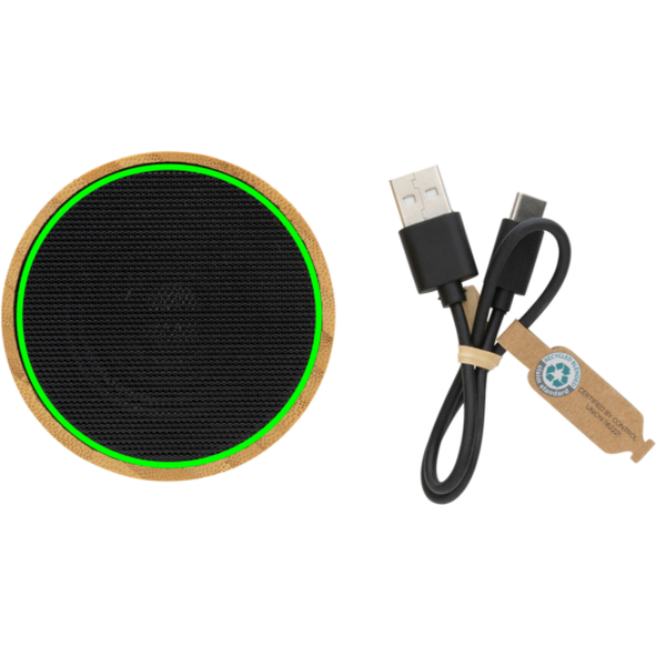 3 W juhtmevaba kõlar, mis on valmistatud FSC® 100% bambusest korpusest ja RCS (Recycled Claim Standard) sertifitseeritud taaskasutatud ABS-ist. Taaskasutatud kogusisaldus: 16% eseme kogukaalust. RCS-sertifikaat tagab taaskasutatud materjalide täielikult sertifitseeritud tarneahela. Kõlaril on allosas integreeritud valgusti. Kõlar on varustatud 300 mAh akuga, et tagada kuni 3 tundi esitusaega ning BT4.1-ga sujuva ühenduse ja selge heli tagamiseks. Ühendusulatus kuni 10 meetrit. Mikrofoniga kõnedele vastamiseks. Pakitud FSC mix FSC® karpi. Kaasa arvatud RCS-sertifikaadiga taaskasutatud TPE laadimiskaabel. Toode ja tarvikud 100% PVC-vaba.