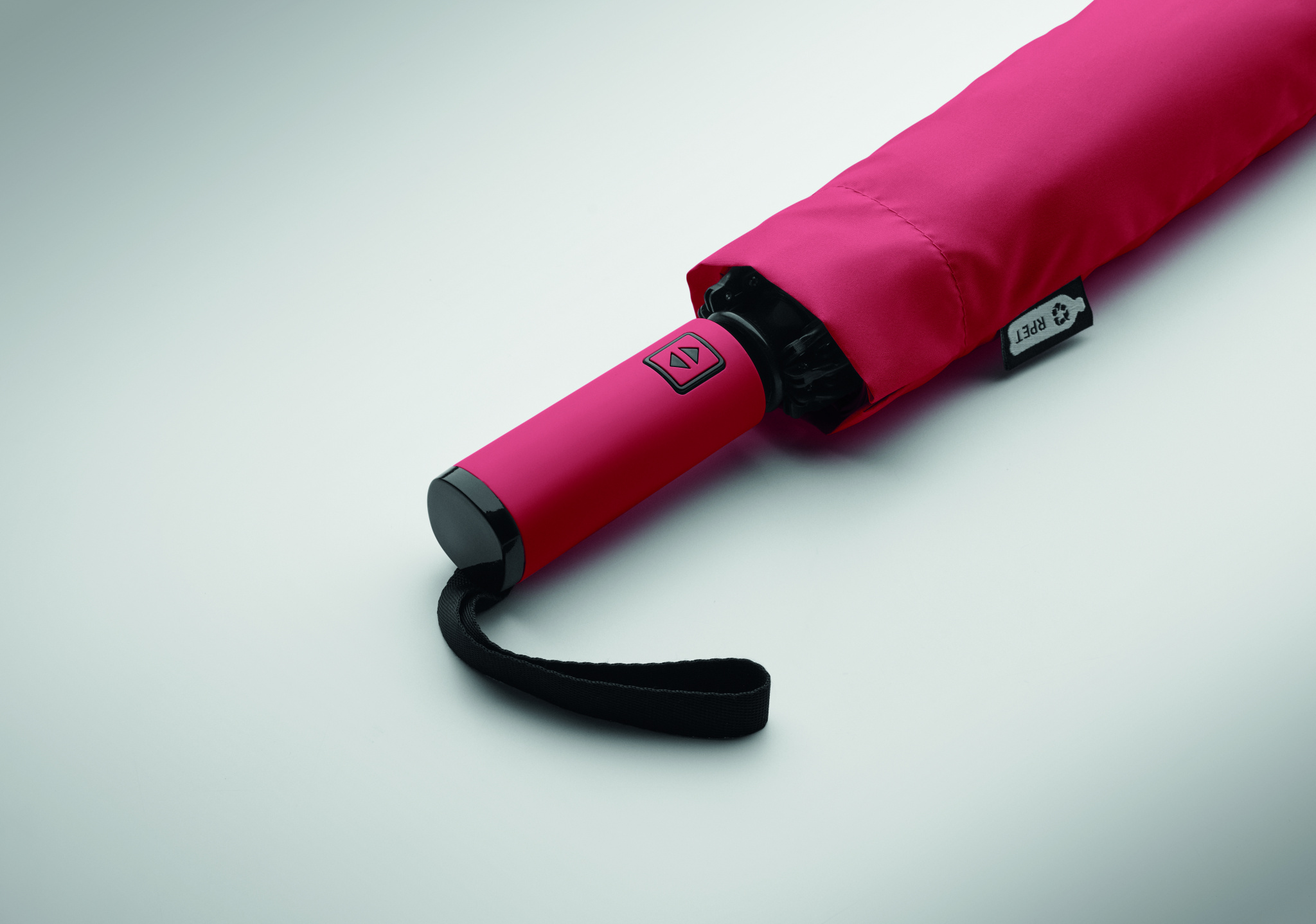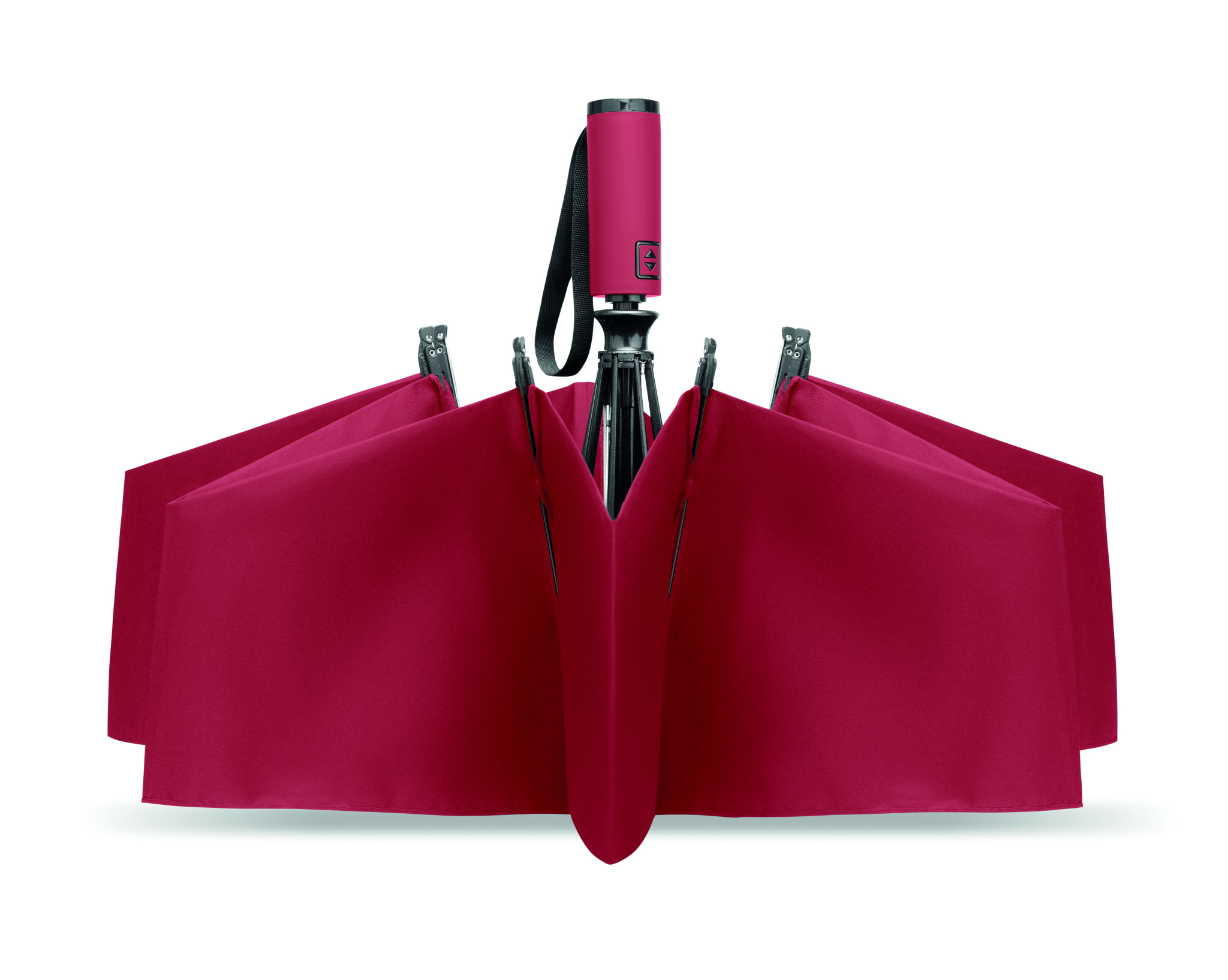23” 3-osainen käänteinen tuulenpitävä sateenvarjo 190T RPET-pongeesta, mukana suojapussi. Automaattinen avaus ja sulku, täysin musta pinnoitettu runko, lasikuituruoteet ja kumipintainen ABS-kahva.