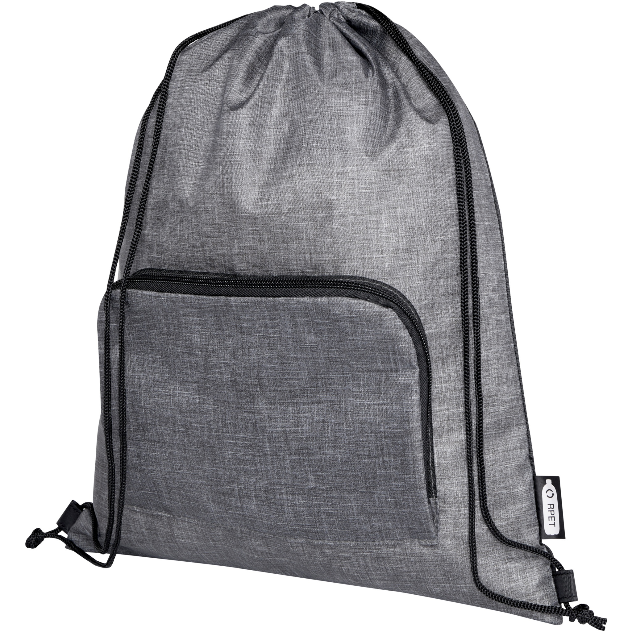 Ash taittuva kierrätetty kiristysnyörillinen kassi, jossa on kiristysnyörillinen päälokero ja vetoketjullinen etutasku, johon kassi voidaan helposti taittaa kuljetusta ja säilytystä varten.