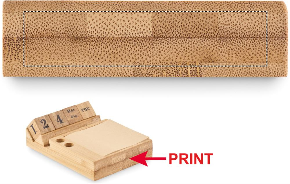Bambuinen pöytäkalenteri puhelintelinetoiminnolla, 2 kynätelinettä ja 50 tarrapaperia.