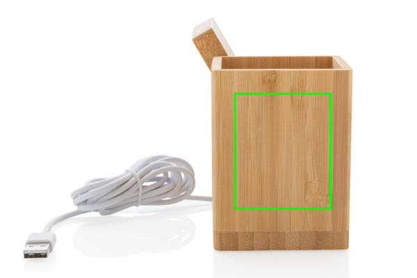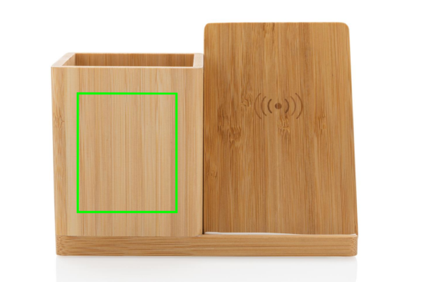 10W pikalaturi kynäpidikkeellä valmistettuna RCS (Recycled Claim Standard) sertifioidusta kierrätetystä ABS:stä. Kierrätetyn materiaalin kokonaismäärä: 6% perustuen tuotteen painoon (sisältäen bambupohjan). Bambuinen ulkokuori valmistettu FSC 100 bambusta. Sisältää 120 cm tyypin C latauskaapelin, joka on valmistettu RCS-sertifioidusta kierrätetystä TPE:stä. Pakattu FSC-sekoituksesta valmistettuun kraft pakkaukseen. Tyyppi C tulovirta: 5V/2A; 9V/1.67A. Langaton lähtövirta: 5V/1A/1.1A (10W) Rekisteröity design®