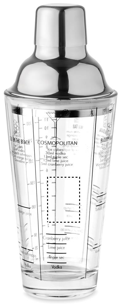 Lasinen cocktail-shaker, jossa on ruostumattomasta teräksestä valmistettu kansi ja lasiin painetut cocktailreseptit ja mittatiedot. Tilavuus: 400 ml.