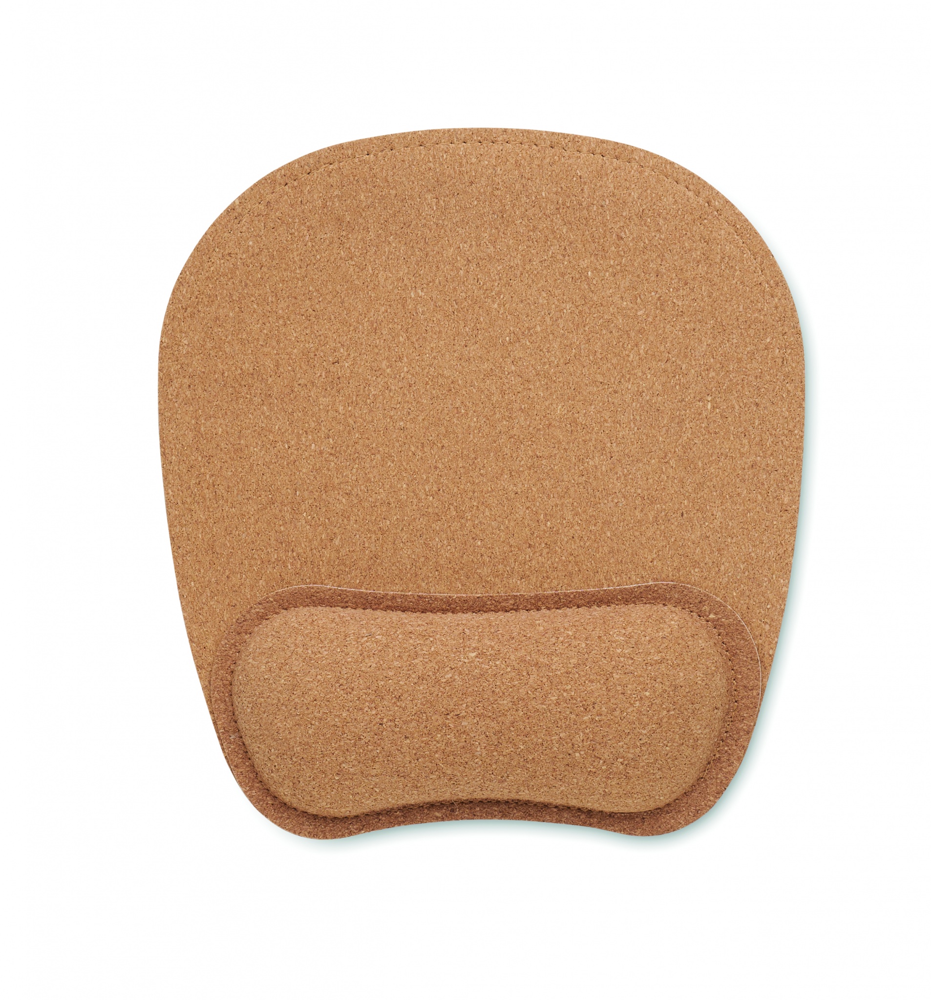Korkkinen ergonominen hiirimatto, jossa on rannetuki. Matossa on liukumista estävä kumipohja.