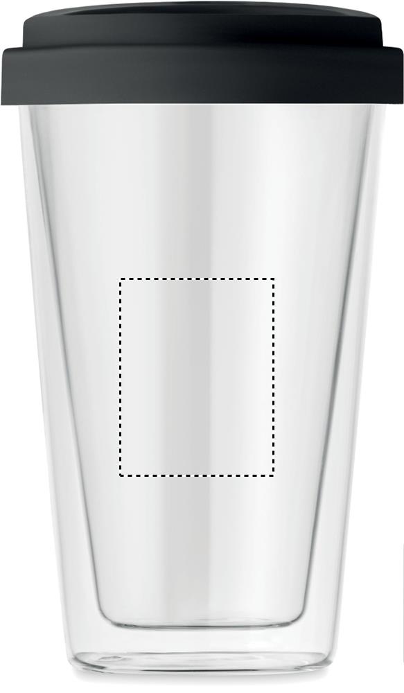 Kaksiseinäinen 350 ml borosilikaatti juomalasi, silikonisella kannella.