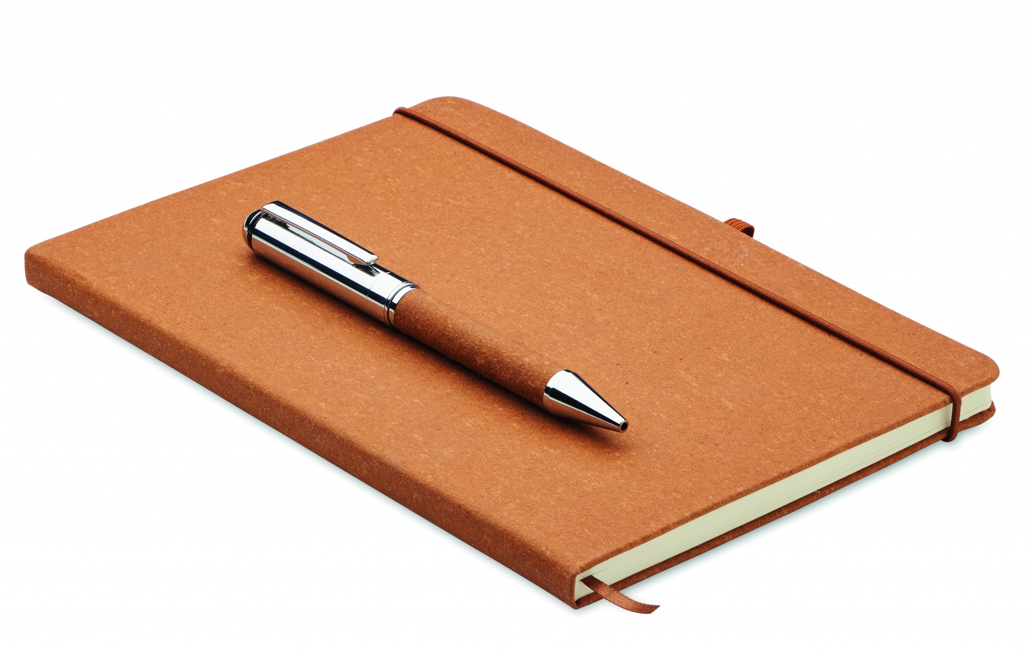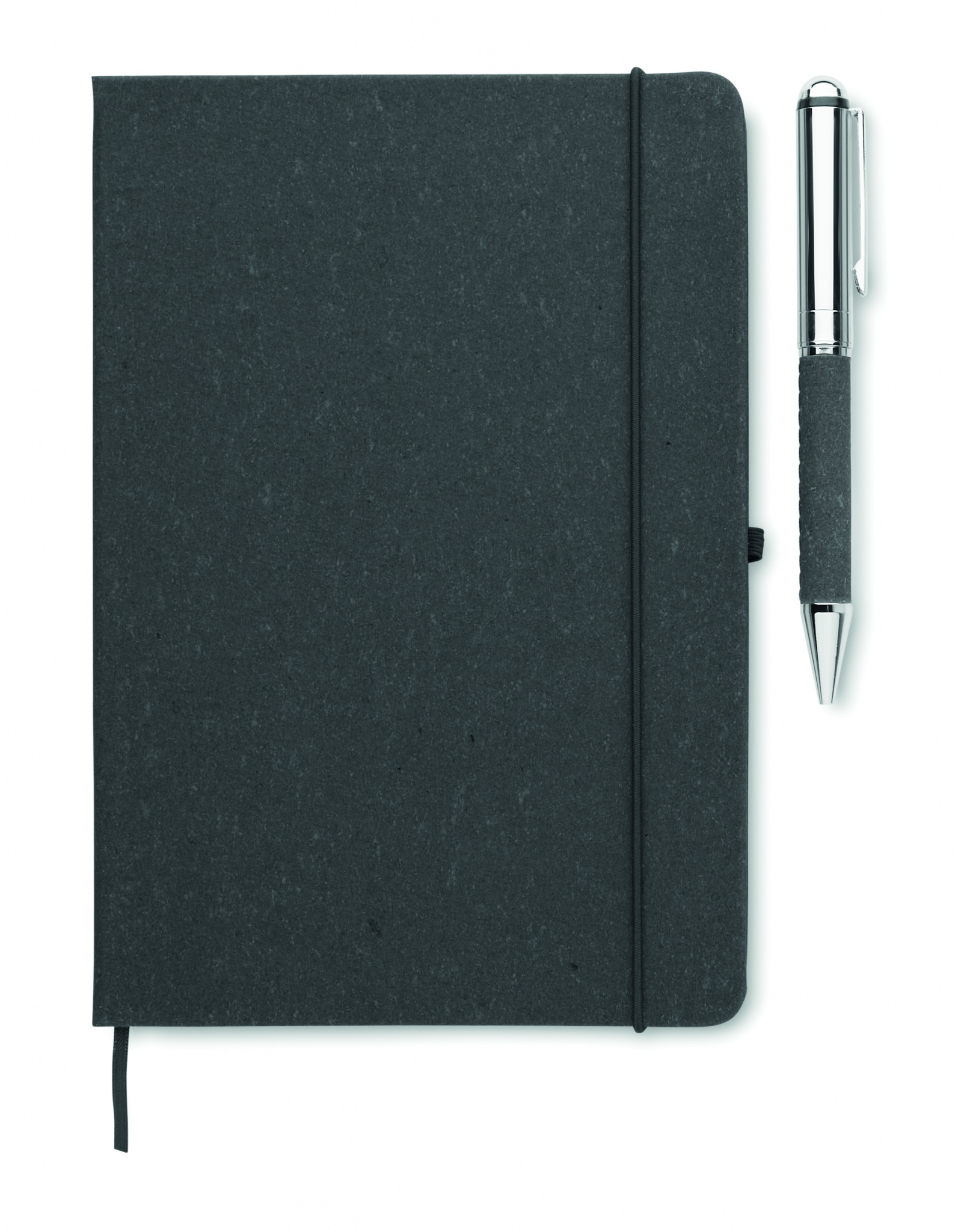 Lahjasetti. Kierrätysnahasta (75 %) valmistettu kovakantinen A5-muistikirja. 160 viivoitettua sivua kierrätyspaperia (80 arkkia). Muistikirjassa sulkunauha, kirjanmerkki ja joustava kynäpidike. Setissä samanvärinen metallinen kierrekynä. Sininen muste. Toimitetaan ruskeassa voimapaperirasiassa.