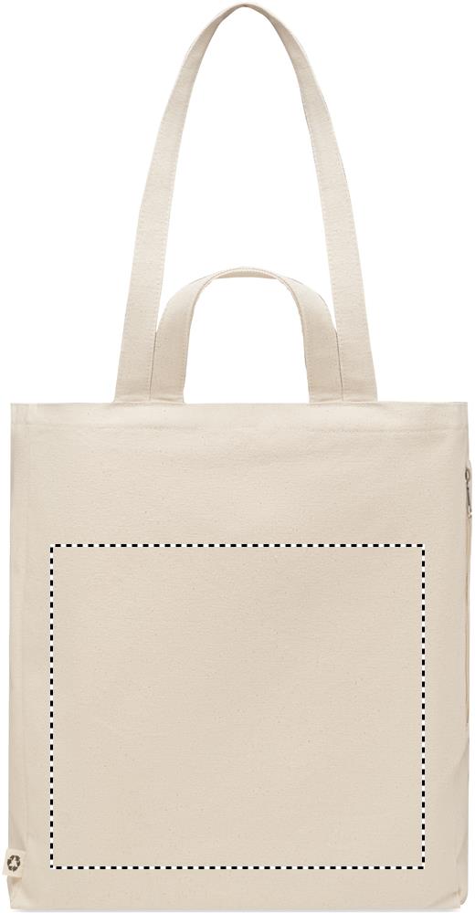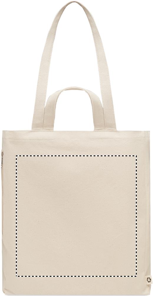 Kierrätysmateriaalista valmistettu ostos- tai rantakassi lyhyillä kantokahvoilla. Kassissa on vetoketjullinen sivutasku. Materiaali 70 % kierrätettyä puuvillaa/ 30 % kierrätettyä polyesteriä, 380 gr/m².