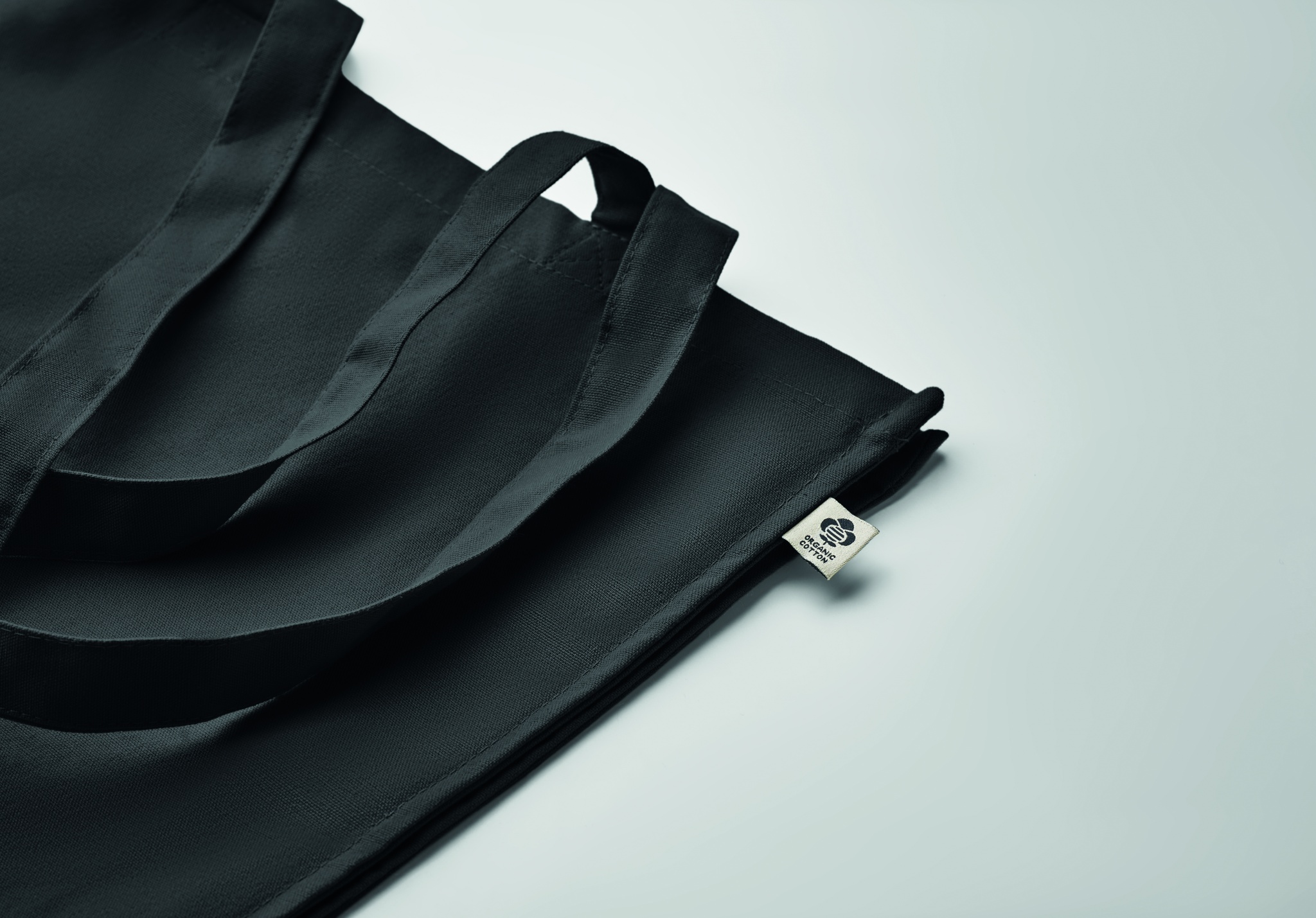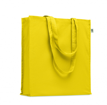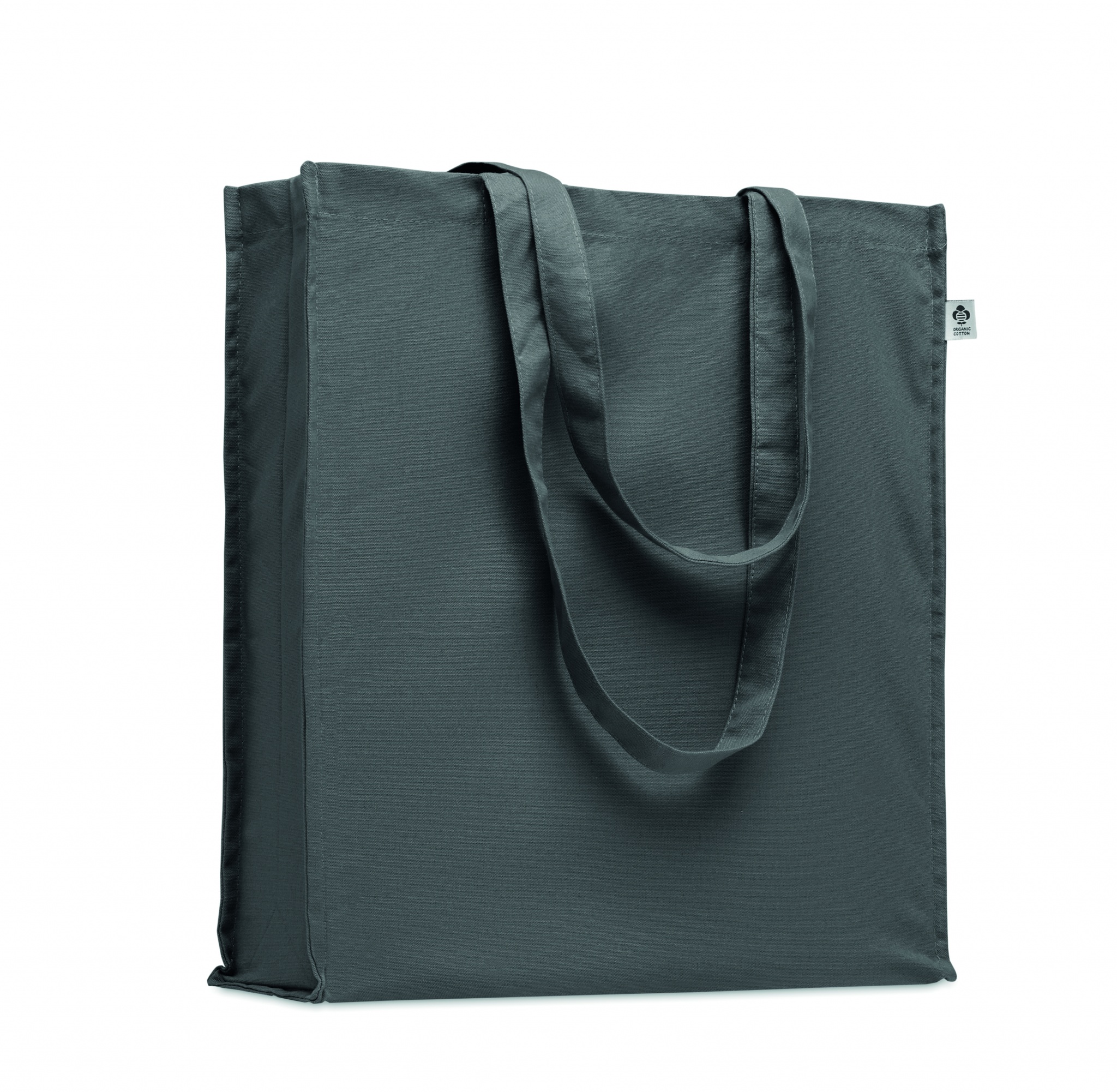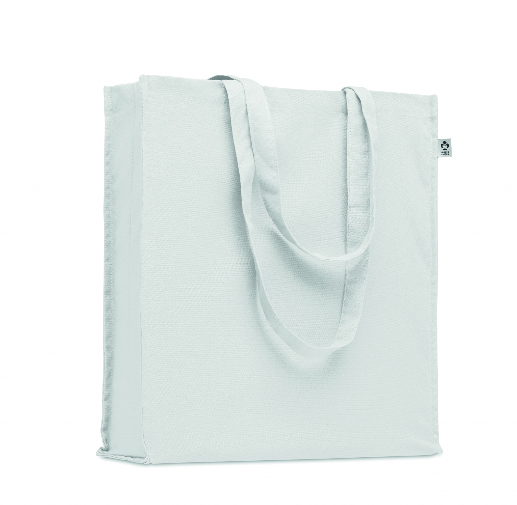 Luomupuuvillasta valmistettu ostoskassi, jossa on pitkät kahvat ja sivutaitteet. 220 gr/m².