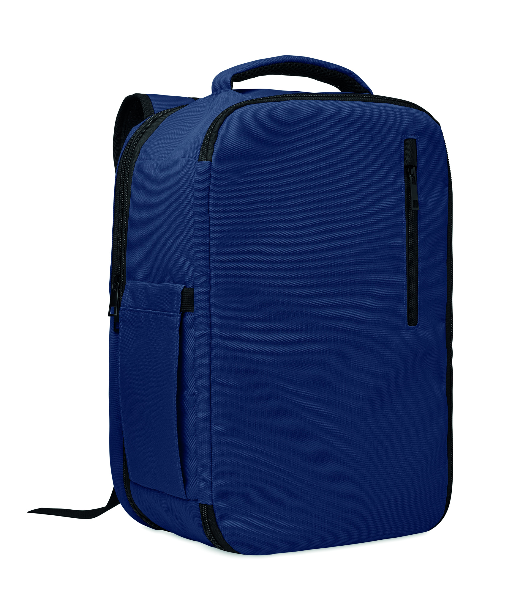 Käsimatkatava laajennettava reppu 600D RPET-polyesteriä, 180° aukko. Sisältää päälokeron, jossa on kaksi avointa osastoa, verkkojako, pehmustettu 15'' tietokoneen tasku ja matkatavarahihnan.