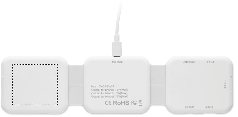 "Magneettinen latausasema ABS-muovista. 3 langatonta latauspistettä. 1 x 15 W, 1 x 5 W TWS:lle ja 1 Apple Watch -laturi (3 W). 2 Type-C- ja 2 USB-A-keskitintä. Liitin Type-C:stä USB-A;han."