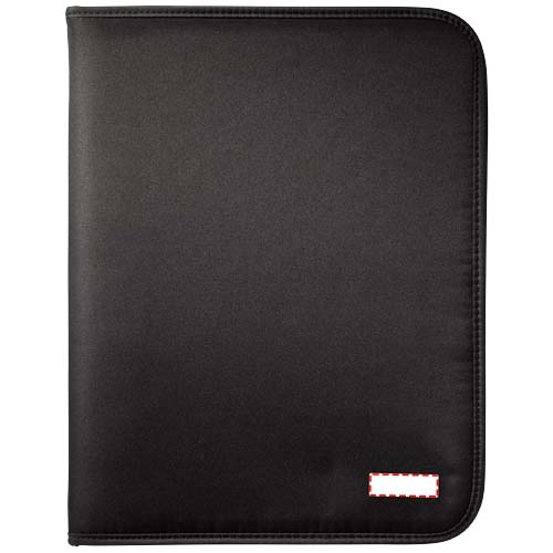 Kansiossa on vetoketju, kynälenkki, asiakirjataskut ja 20 viivoitettua muistipaperia. Kynä ja tarvikkeet rekvisiittaa.