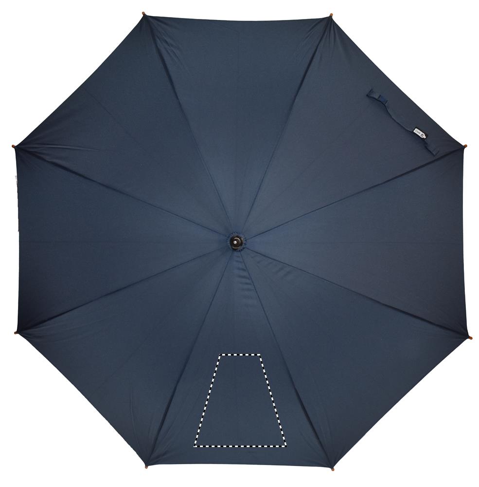 23 colių automatiškai atidaromas skėtis iš 190T RPET su mediniu kotu, antgaliais ir viršumi. Juodai dengti metaliniai šonkauliai. Lenkta natūralios apdailos medinė rankena. Rankinis uždarymas.