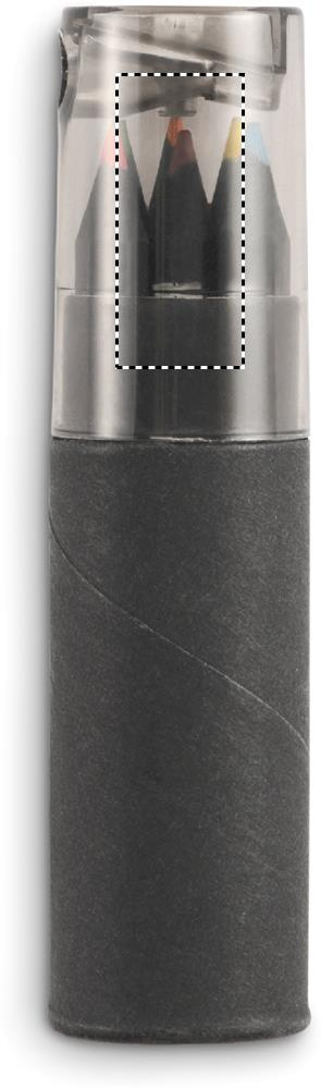 Melna krāsaina papīra tūbiņu kastītē ir 6 krāsojamie zīmuļi un zīmuļu asināmais kastītes vākā.