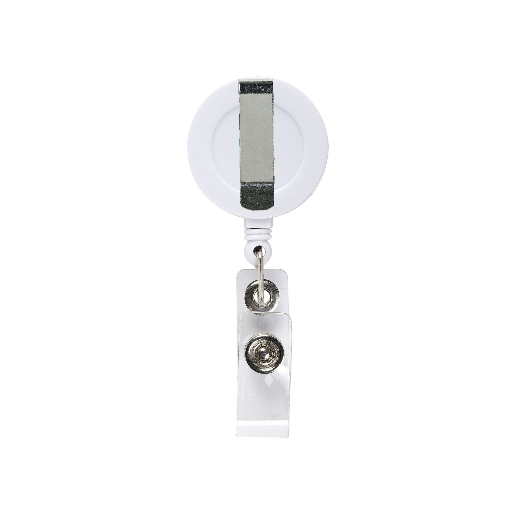 Žetonu/apliecības turētājs ar metāla jostas klipsi, izvelkamu neilona auklu un spiedpogu aizdari.