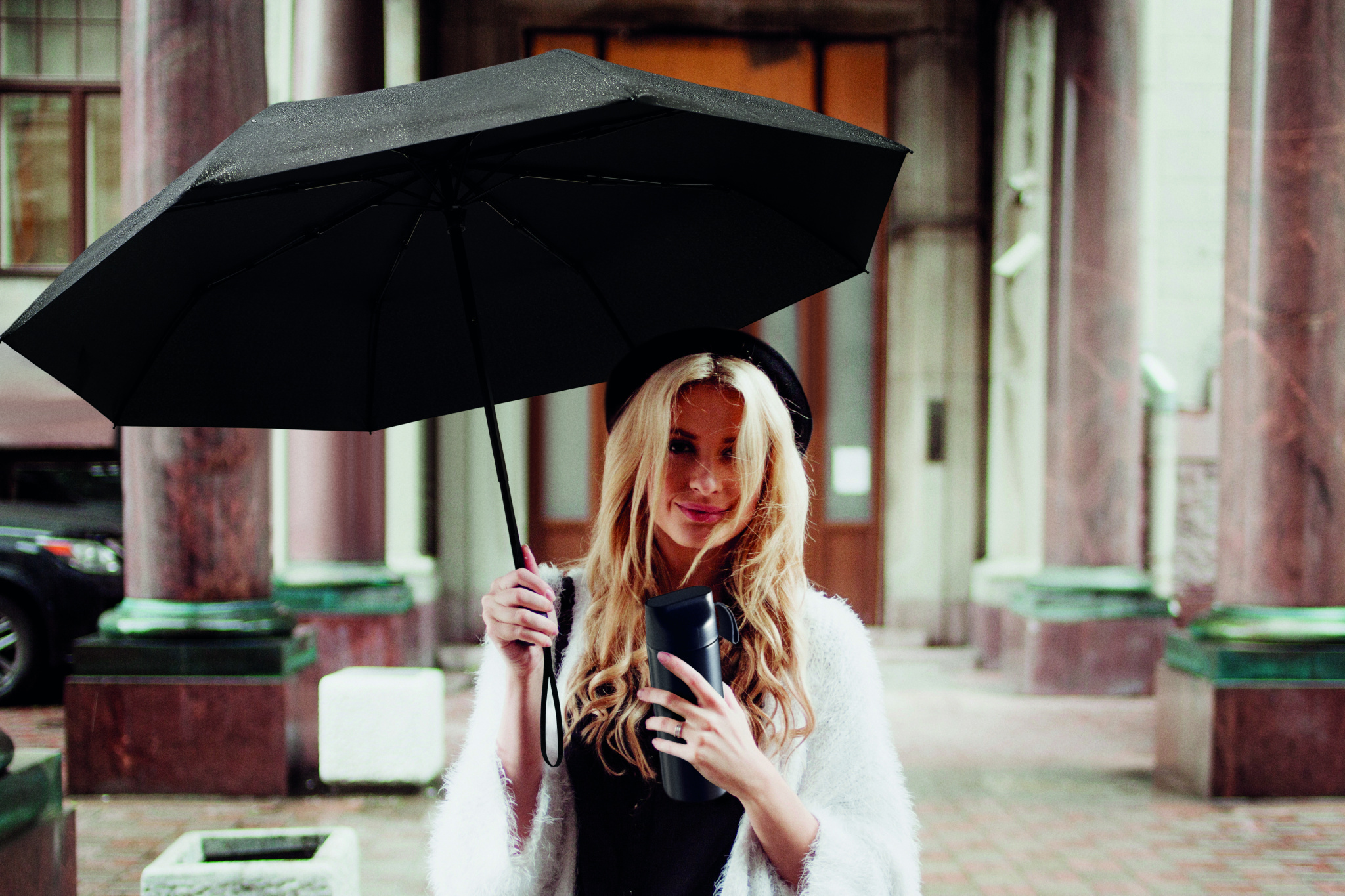 2-piece gift set with 600 ml double wall recycled stainless steel bottle with PP lid, metal detail, and silicone handle, plus 21'' foldable windproof pongee umbrella with ABS handle in gift box.
