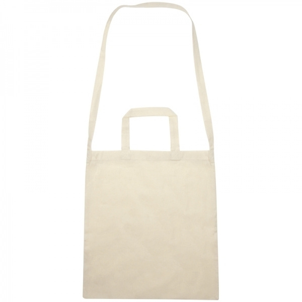 Сумка из экологически чистого хлопка в натуральном цвете с двумя короткими ручками и одним длинным ремнем для переноски. Мы напечатаем ваш логотип на одной стороне.