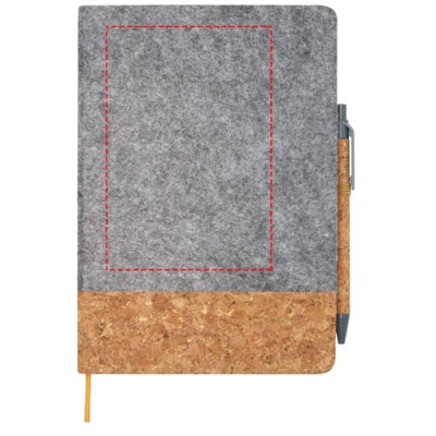 Блокнот формата A5 в твердой обложке изготовлен из пробки и переработанного фетра и состоит из 80 разлинованных листов бумаги плотностью 70 г/м², эластичной застежки, закладки-ленты и петли для ручки. Кнопка, зажим и кончик шариковой ручки изготовлены из переработанного пластика, а корпус — из пробки. Чернила для ручки: черный. Длина непрерывной линии: 600 метров. Размер пера: 1,0 мм.