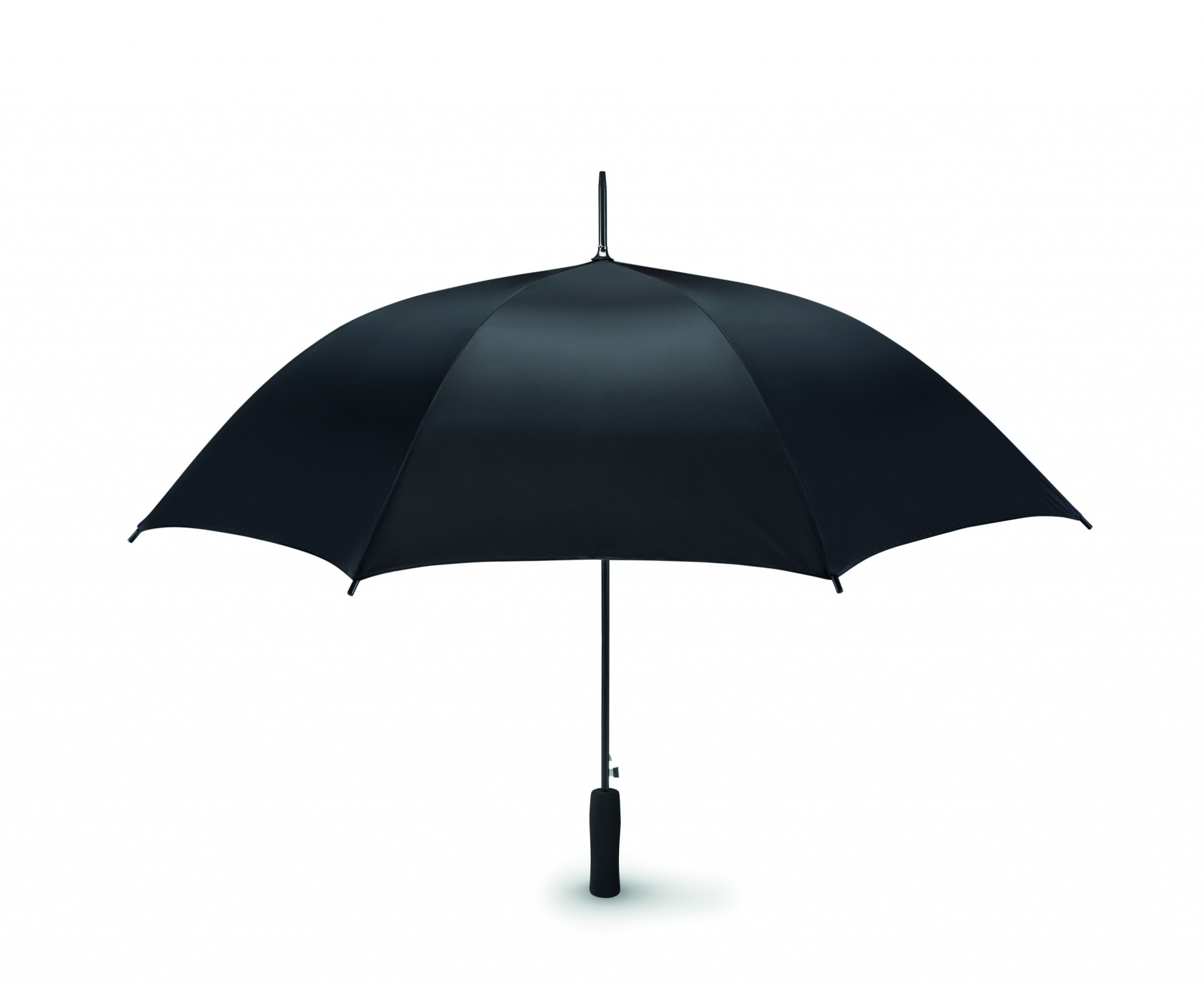 Promenadparaply, 23 tums i 190T polyester med svart pläterat stålskaft och spröt. Svarta plast tippar. Rakt svart handtag i mjukt EVA material. Manuel stängning och automatisk öppning.