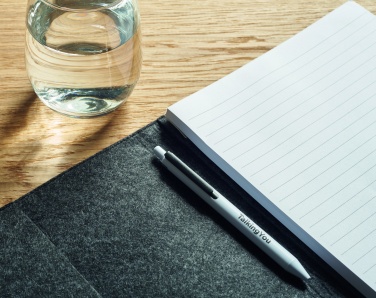 A4-konferensmapp i RPET-filt. Anteckningsblock med 100st linjerade blad. Elastisk pennhållare. Den har flera fack.