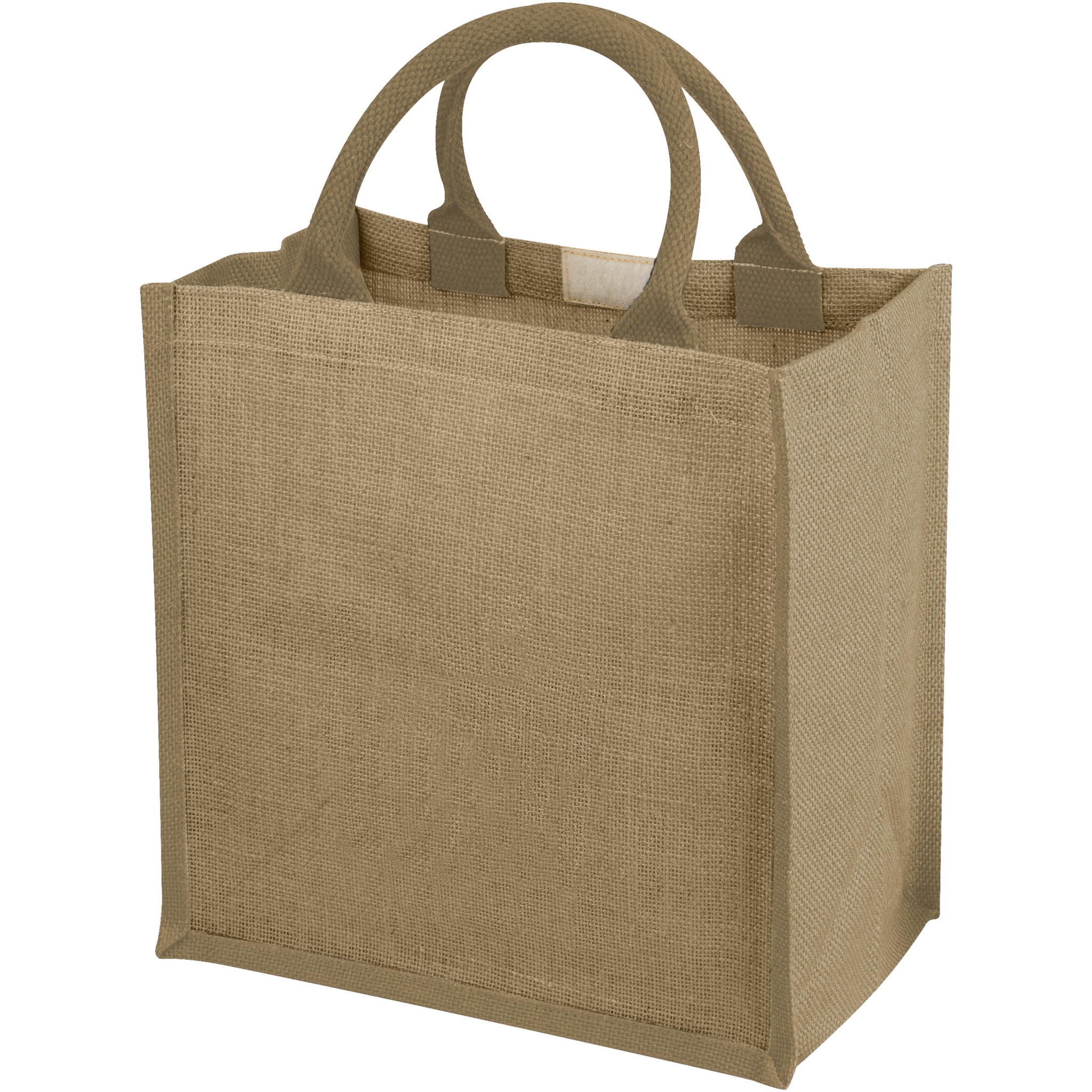 Chennai jutekasse är perfekt för utflykter till parken, stranden eller matbutiken. Med sitt jutematerial är den ett miljövänligt val. Kassen har ett laminerat öppet fack och kil, vilket gör den idealisk för att bära tunga föremål. Handtagen i bomull garanterar ett bra och bekvämt grepp och dessutom garanterar krok- och öglestängningen att alla tillhörigheter ligger skyddade. Tillverkad i Indien och OEKO-Tex-certifierad. Bärkraft upp till 10 kg vikt.